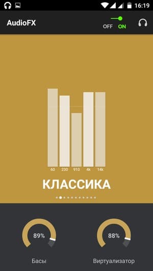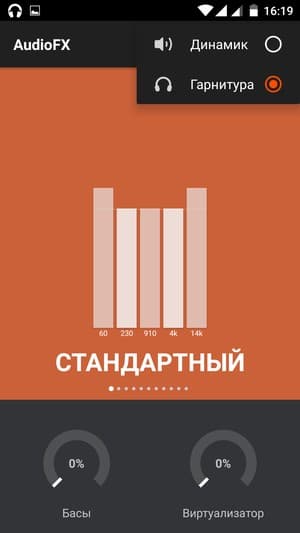 Собственного аудиопроигрывателя в смартфоне нет, для этого используется стандартная программа Google Play Music. Для ручного управления в настройках встроенной звуковой системы AudioFX предусмотрена масса предустановленных значений эквалайзера раздельно для основного динамика и наушников. Также можно дополнительно повысить низкие частоты и добавить виртуальный объем. При добавлении басов, как водится, звучание становится более глухим и менее громким, лучше с этим не переусердствовать.
