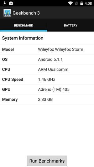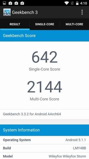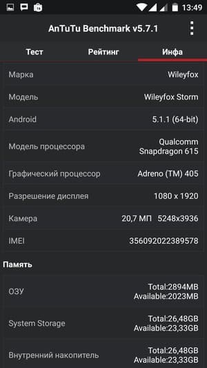 Аппаратная платформа Wileyfox Storm строится на базе однокристальной восьмиядерной 64-битной SoC Qualcomm Snapdragon 615 обновленной версии v2. Правда, в отличие от того же продвинутого Xiaomi Mi 4i, где используется SoC Snapdragon 615 второго поколения с увеличенной максимальной частотой работы ядер до 1,65 ГГц, здесь частота ядер составляет все те же 1,5 ГГц (1,46 ГГц, если судить по данным CPU-Z). Платформа выполнена по технологии big.LITTLE, где четыре процессорных ядра Cortex-A53 соседствуют с четырьмя такими же ядрами Cortex-A53, но у этих «четверок» различается максимальная частота работы. В зависимости от характера и степени загрузки включаются либо 4 «младших» (до 1 ГГц), либо 4 «старших» (до 1,5 ГГц) ядра, что позволяет экономить энергию.