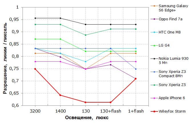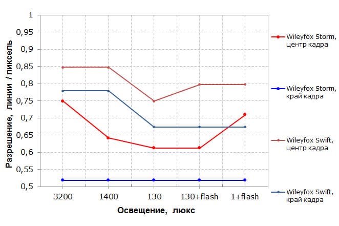 Все недостатки хорошо отражает лабораторный тест, где видно влияние всех вышеперечисленных факторов в совокупности. На фоне младшей модели камера Wileyfox Storm выглядит совсем недостойно, и в нынешнем виде она, пожалуй, справится лишь с нетребовательной документальной съемкой, хотя при определенной сноровке можно рассчитывать на относительно неплохой результат. Вероятно, при хорошем освещении в солнечную погоду камера тоже сможет выдавать достаточно неплохой результат.