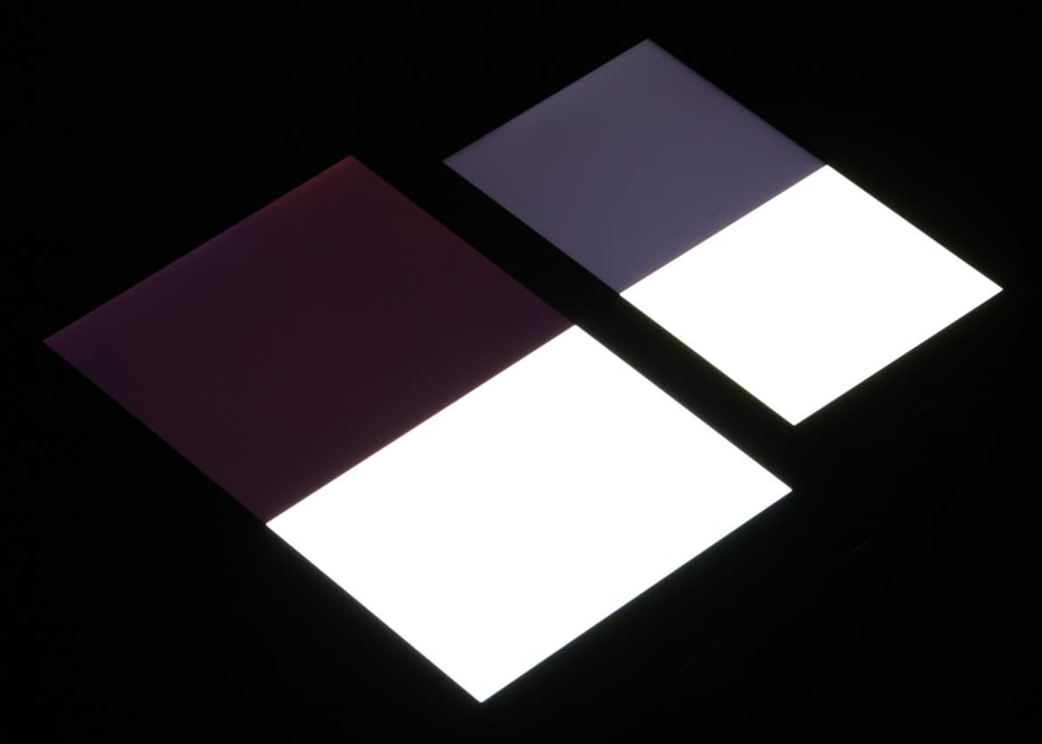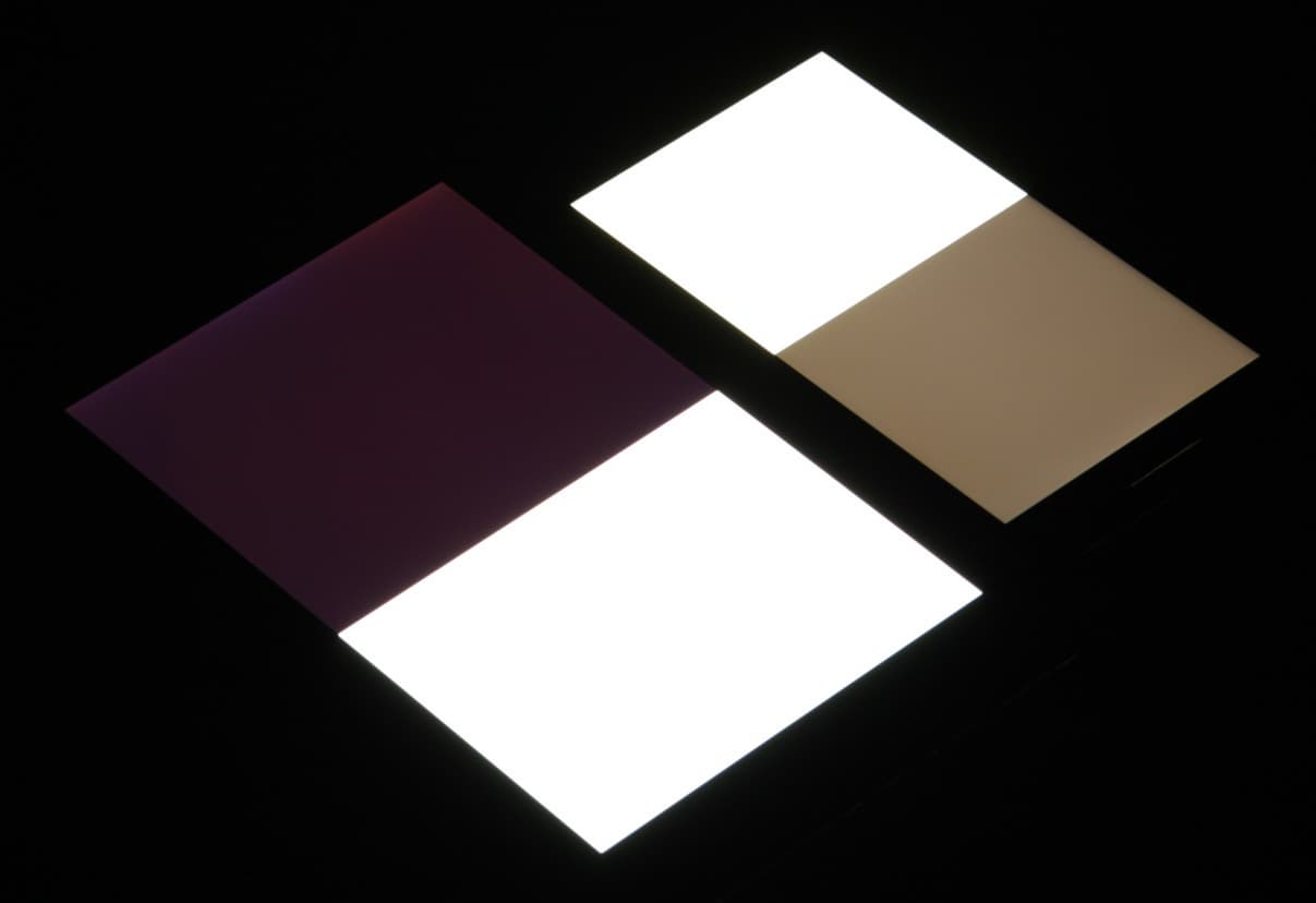 Яркость под углом у экранов уменьшилась (как минимум в 5 раз, исходя из разницы в выдержке), но у Wileyfox Storm экран заметно темнее. Черное поле при отклонении по диагонали высветляется сильно и приобретает легкий фиолетовый или красноватый оттенок. Фотографии ниже это демонстрируют (яркость белых участков в перпендикулярном плоскости экранов направлении одинаковая!):
