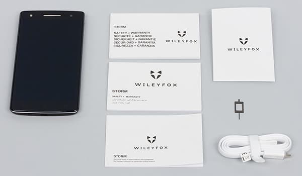 Главной отличительной особенностью упаковок новых продуктов Wileyfox является их подчеркнутая аскетичность. В комплектации к смартфонам нет ничего, кроме одного лишь соединительного кабеля Micro-USB да увесистой стопочки бумажной документации. Также в набор к смартфону вложен металлический ключик для извлечения SIM-карты.