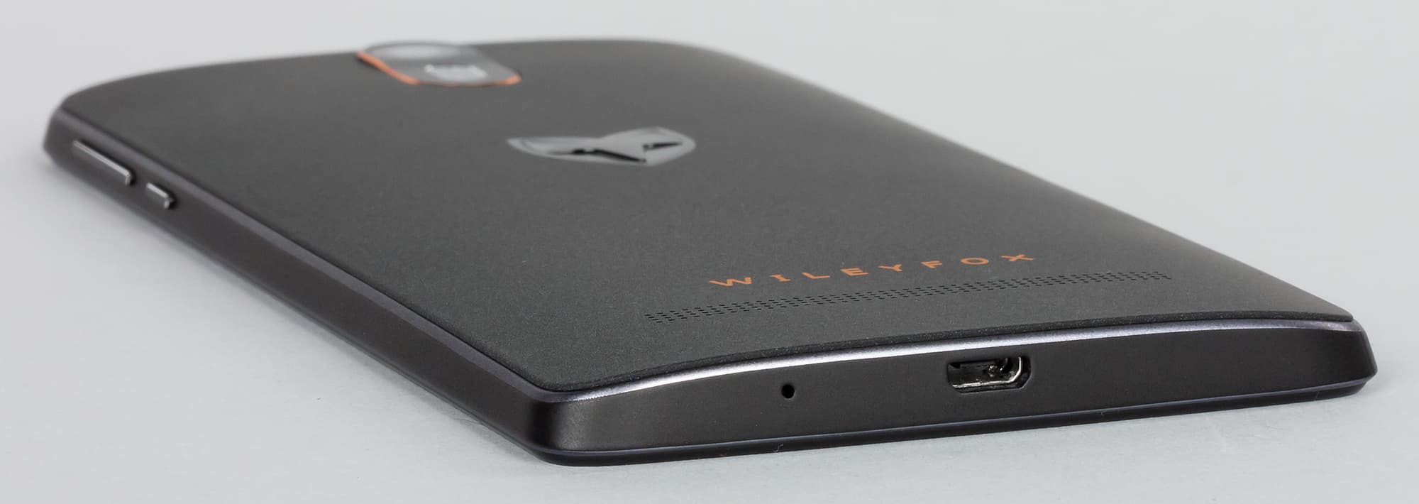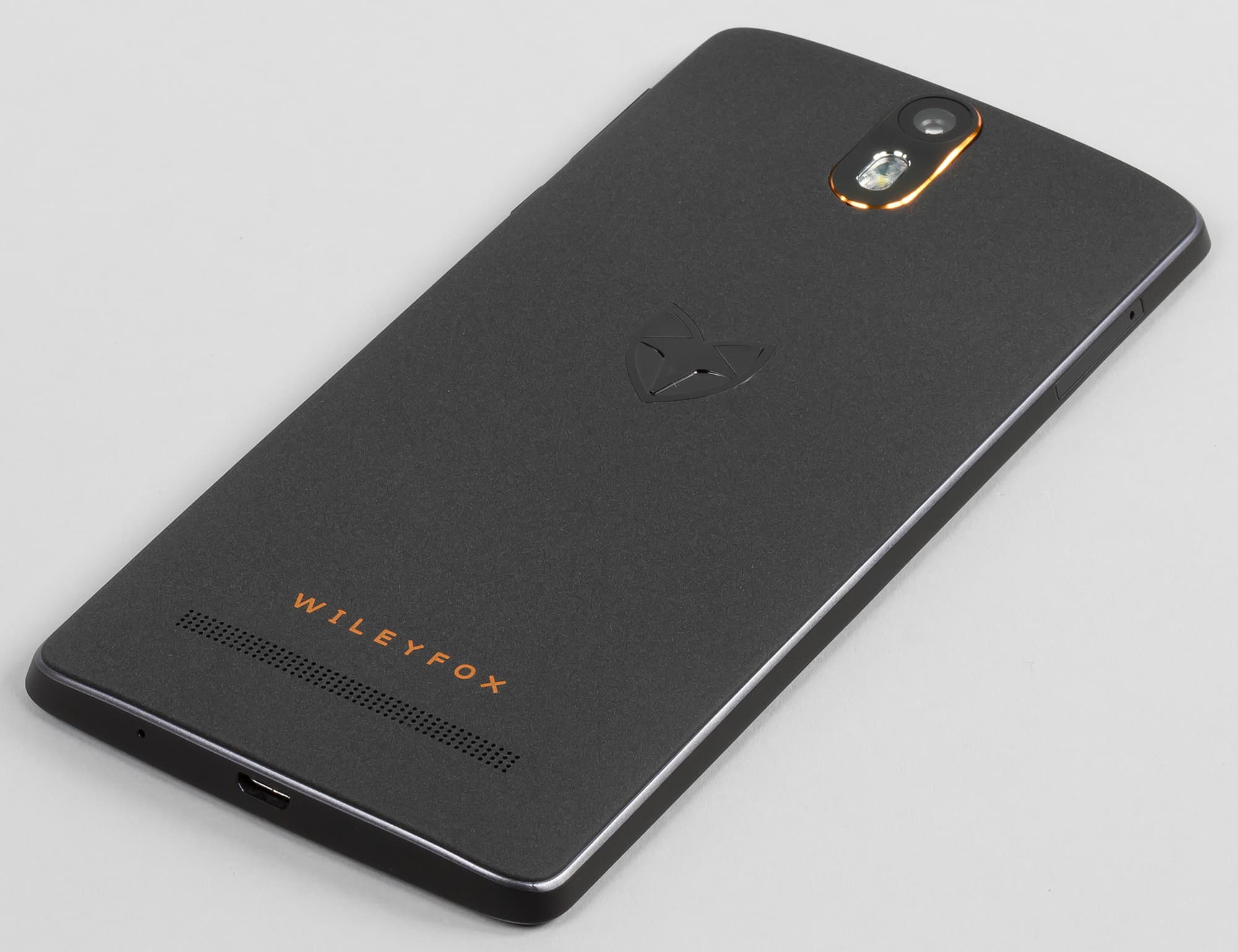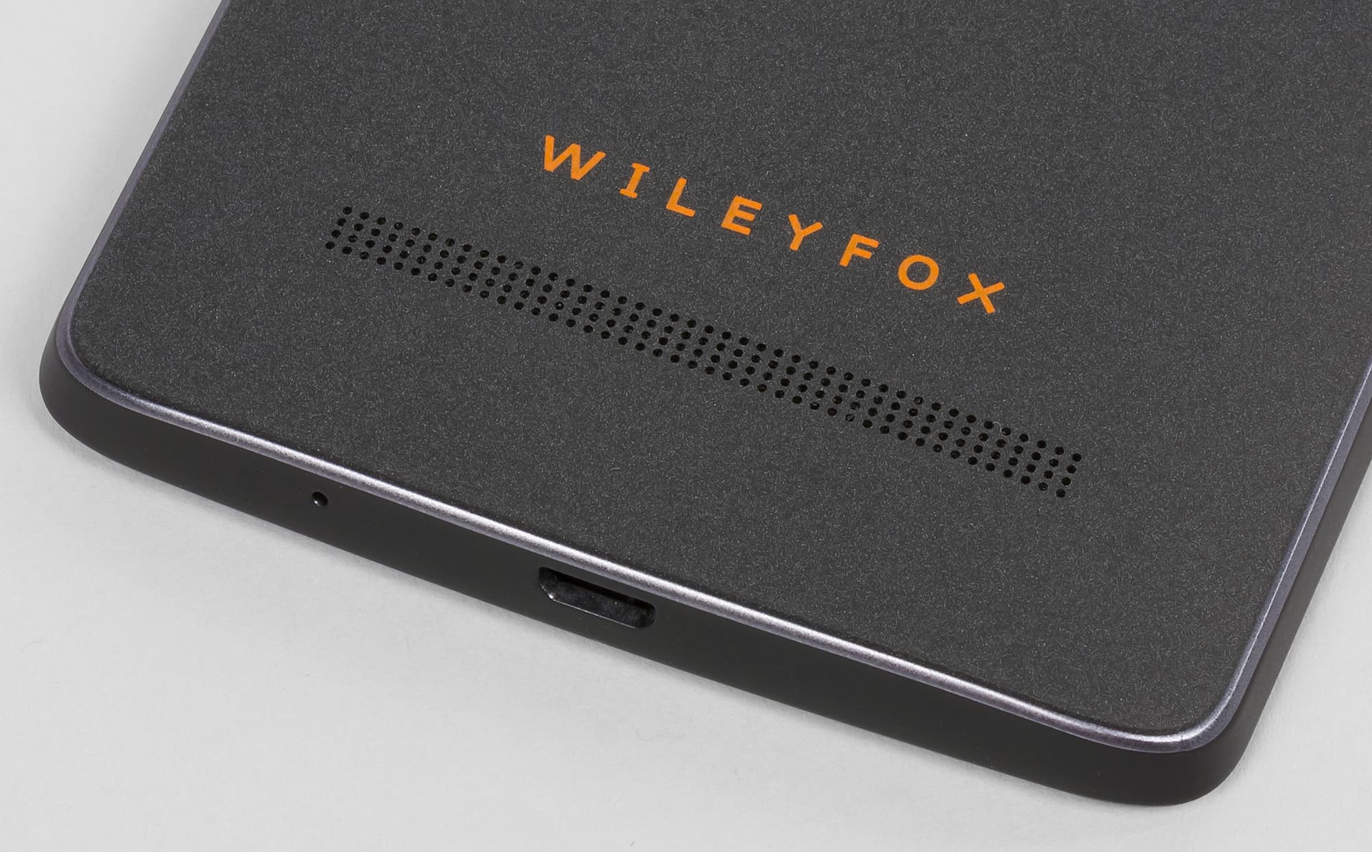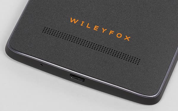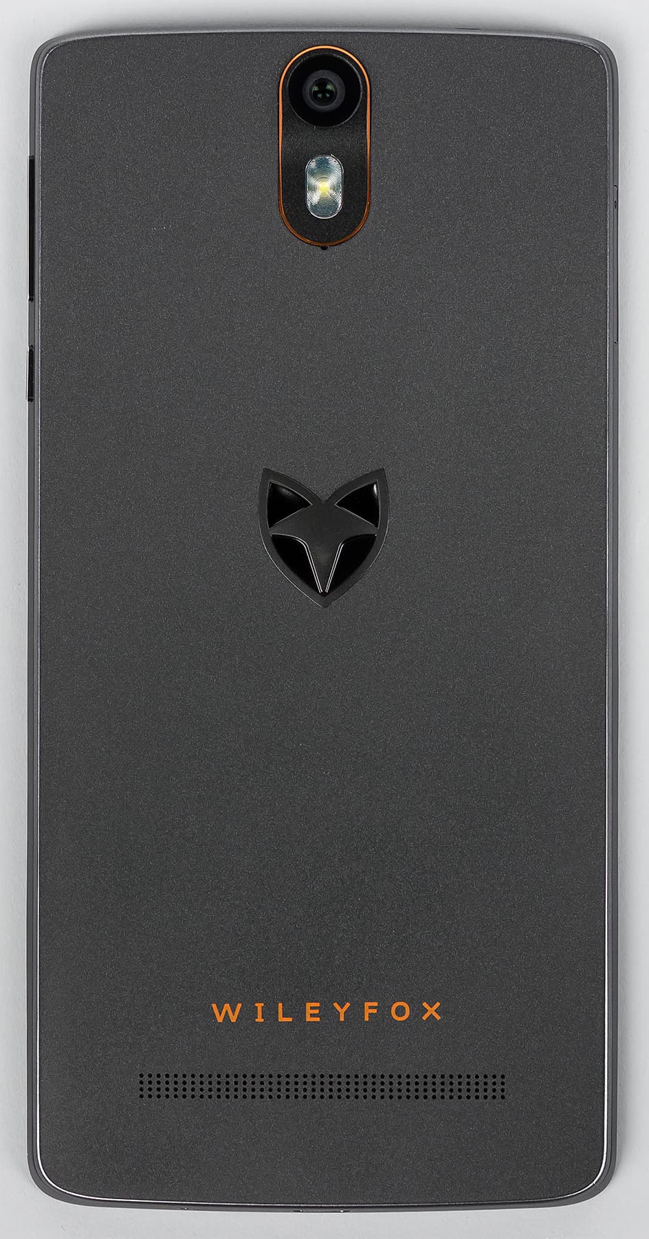 Тыльную поверхность корпуса Wileyfox Storm украшает фирменный логотип в виде стилизованной лисьей морды (fox по-английски означает «лиса»). На русскоязычной странице сайта он назван «металлическим», но это просто неправильный перевод. Скорее всего, в оригинале имелась в виду именно схожесть, поскольку под определенным углом этот простой выдавленный в пластмассе без применения серебристой краски или металла логотип действительно слегка отливает металлическим блеском.
