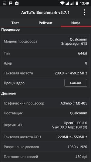 - SoC Qualcomm Snapdragon 615 (MSM8939), 8 ядер ARM Cortex-A53 @1,5 ГГц