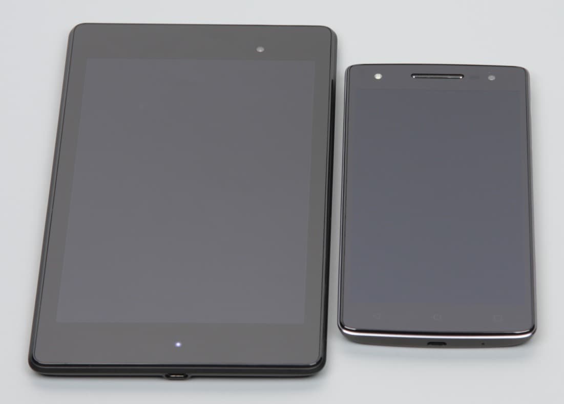 Лицевая поверхность экрана выполнена в виде стеклянной пластины с зеркально-гладкой поверхностью, устойчивой к появлению царапин. Судя по отражению объектов антибликовые свойства экрана не хуже, чем у экрана Google Nexus 7 (2013) (ниже просто Nexus 7). Для наглядности приведем фотографию, на которой в выключенных экранах отражается белая поверхность (слева — Nexus 7, справа — Wileyfox Storm, далее их можно различать по размеру):