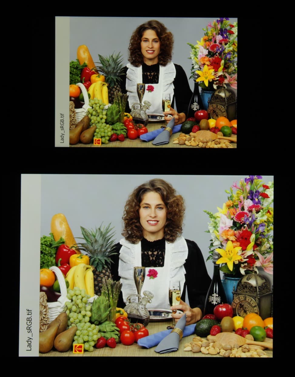 Однако отклонения координат первичных цветов от вершин треугольника sRGB небольшие, поэтому цвета имеют естественную насыщенность и оттенок. Баланс оттенков на шкале серого средний, так как цветовая температура лишь немного выше стандартных 6500 К и отклонение от спектра абсолютно черного тела (ΔE) меньше 10, что для потребительского устройства считается приемлемым показателем. Однако при этом ΔE сильно изменяется от оттенка к оттенку — это отрицательно сказывается на визуальной оценке цветового баланса. (Самые темные области шкалы серого можно не учитывать, так как там баланс цветов не имеет большого значения, да и погрешность измерений цветовых характеристик на низкой яркости большая.)