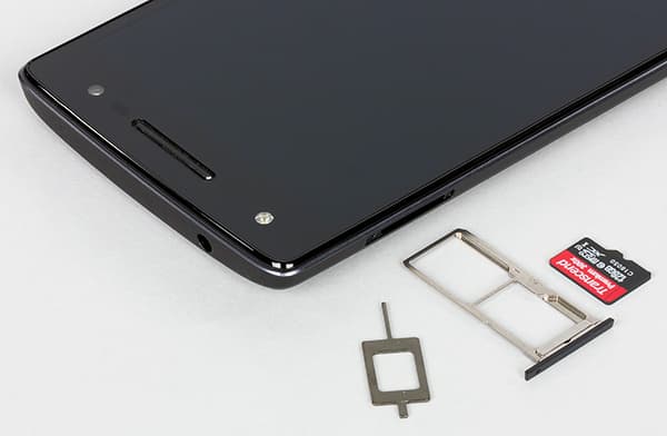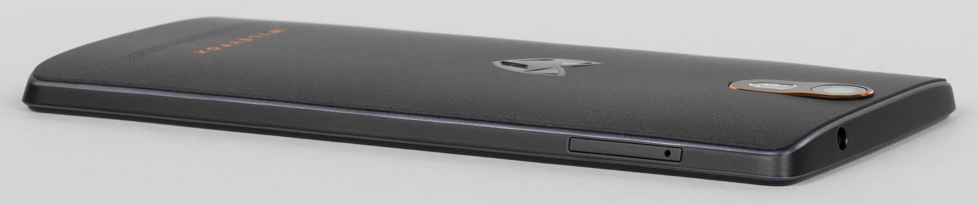 В отличие от младшей модели, крышка здесь несъемная, так что карточки вставляются в боковой щелевой разъем, въезжая в него на салазках. Сдвоенный слот может принять одновременно либо две SIM-карты (одну Nano-SIM и одну Micro-SIM), либо одну SIM-карту (Micro-SIM) и карту памяти microSD. Кстати, поддерживается горячая замена SIM-карт без необходимости перезагрузки устройства. Одновременно с двумя SIM-картами и с картой памяти смартфон работать не может.