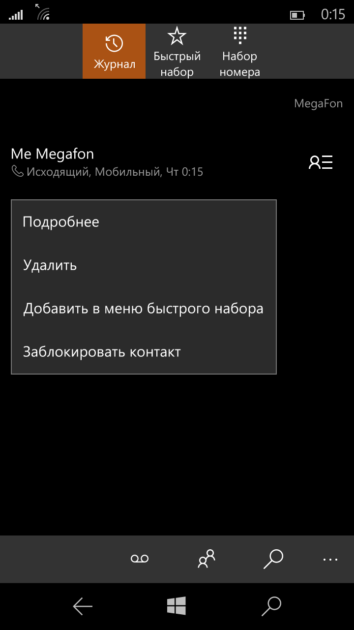 Серьезные изменения претерпело приложение для работы с телефонными вызовами, попросту «звонилка». Во-первых, окно набора номера (телефонная клавиатура) получило отдельную вкладку. Всего вкладок теперь три: Журнал, Быстрый набор, Набор номера. Быстро переключаться между ними горизонтальным взмахом пальца по экрану больше нельзя — возможно, эту функцию вернут в финальном релизе операционной системы. Без такого переключения перемещаться между вкладками очень неудобно, особенно если вы управляете смартфоном одной рукой, а у него большой дисплей — приходится тянуться пальцем к значкам, расположенным очень высоко на экране (в последней прошивке добавлена функция «сдвига» экрана вниз по двойному нажатию на кнопку «Пуск»). Второе нововведение относится к категории «все новое — это хорошо забытое старое»: быстрый поиск контакта в записной книжке. То, что было в старой Windows Mobile и что давно есть в конкурирующих мобильных ОС, снова появится в Windows 10 Mobile. Смысл функции очень прост: вы вводите первые символы имени или цифры телефонного номера на телефонной же клавиатуре, и программа предлагает вам подходящие контакты из адресной книжки смартфона.