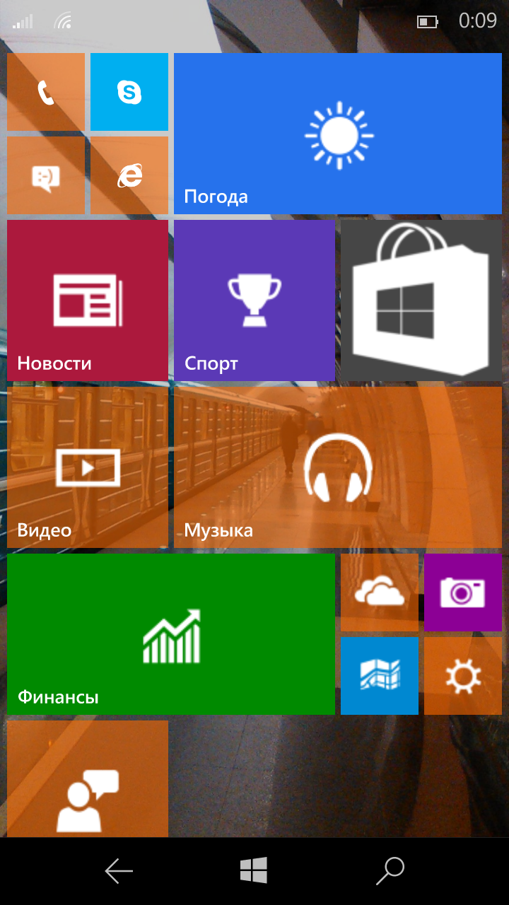 При переходе к основному экрану операционной системы в глаза бросаются основные нововведения, связанные с «плиточным» интерфейсом Windows 10 Mobile. Появилась возможность устанавливать фон для основного экрана операционной системы и списка приложений. Фотографию можно выбрать любую, все элементы интерфейса будут выводиться поверх нее, прозрачность настраивается. Как и во втором пакете обновлений для Windows Phone 8.1, в Windows 10 Mobile можно создавать группы из плиток. Общий принцип такой же, как и в других мобильных операционных системах: при касании группы появляется увеличенный список входящих в нее приложений. Сами группы создаются перетягиванием одной плитки на другую.