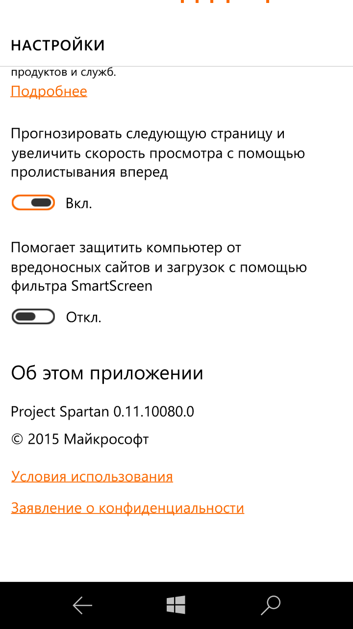 Есть также некий встроенный браузер, который вызывается из других приложений — например, через функцию поиска. В настройках этой программы указано название Project Spartan и версия 0.11. Вероятно, именно он заменит Inernet Explorer в будущих сборках мобильной операционной системы и тогда же получит название Microsoft Edge.