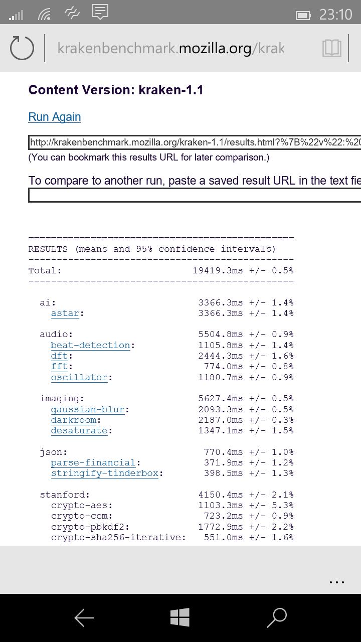 Итак, первый тест, SunSpider, разницы в двух браузерных движках не обнаружил. Тест Kraken показал увеличение скорости работы JavaScript на четверть. Тест Octane закончил свою работу почти в два раза быстрее. В целом — отличный результат.