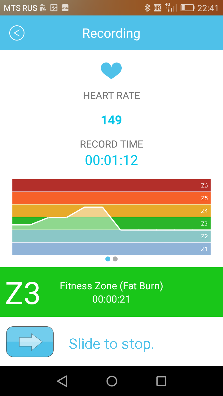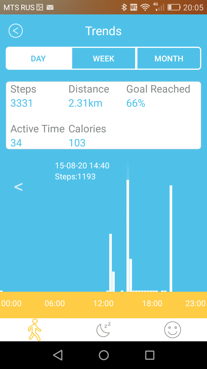 По отслеживанию повседневной активности хвалить браслет тоже не за что, но, впрочем, и ругать рука не поднимается. Все стандартно: помимо собственно количества шагов в приложении можно посмотреть пройденное расстояние, процент достижения цели, количество сброшенных калорий и продолжительность ходьбы. Плюс к этому есть возможность включить напоминания о необходимости двигаться (эта функция нам хорошо знакома по браслетам Jawbone).