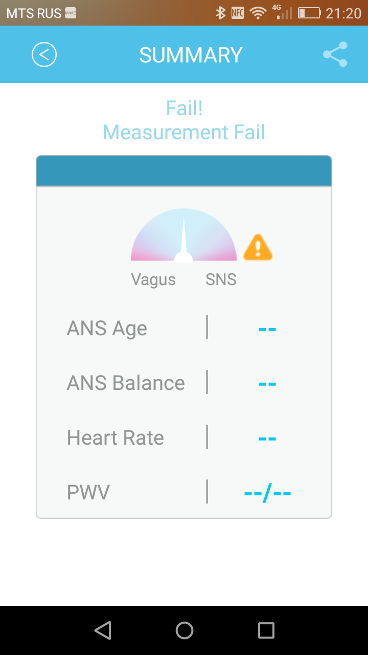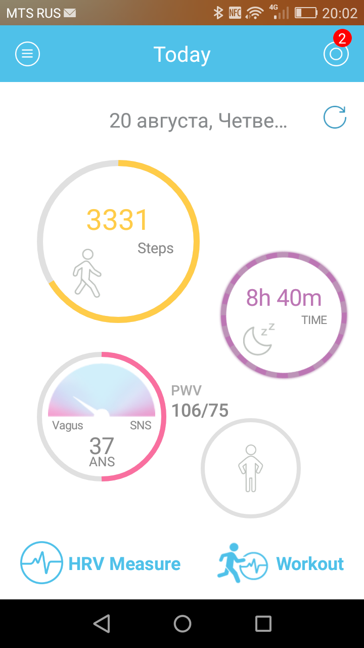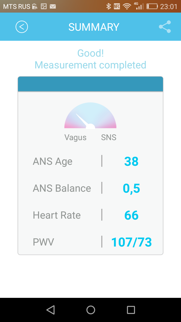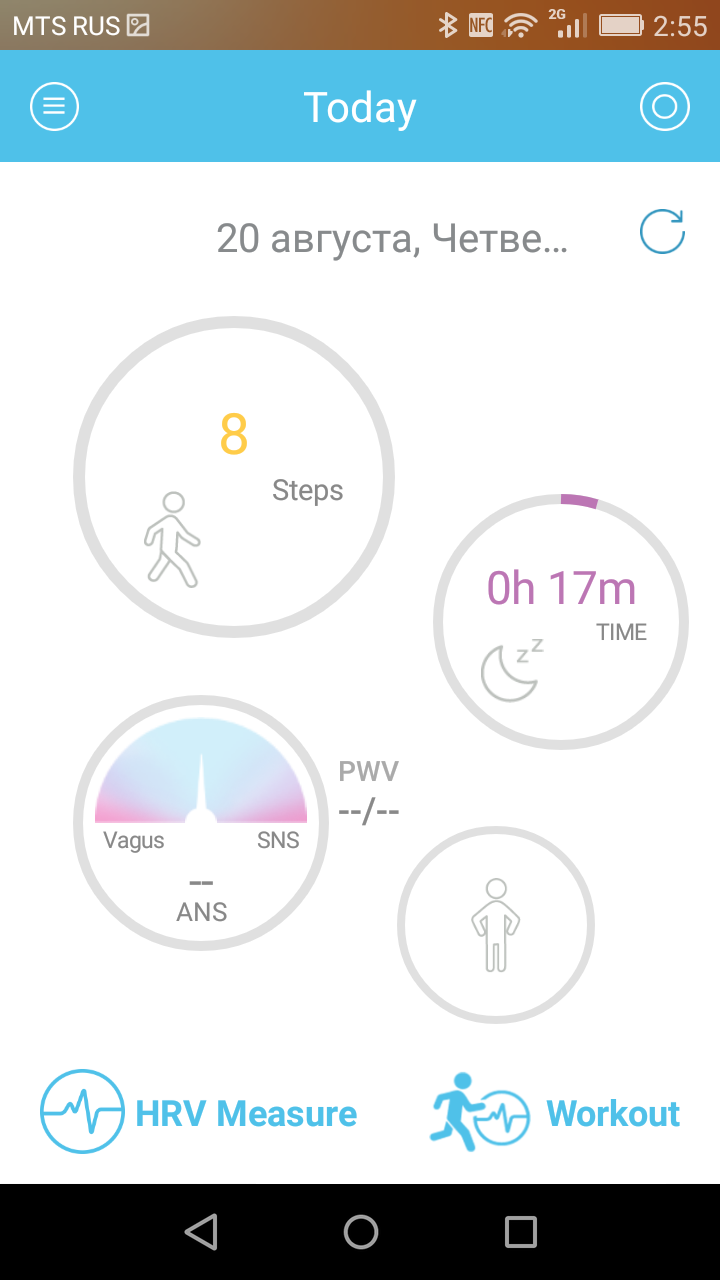 Теперь поговорим об ANS Balance и ANS Age. ANS — это autonomic nervous system, то есть вегетативная нервная система (ВНС). Предполагается, что ANS Balance — это состояние вашей нервной системы, определяемое на основании вариабельности сердечного ритма. В норме стрелка должна быть по центру, с небольшим отклонением влево или вправо, что соответствует значению 1. Вот здесь все это обосновывается теоретически (статья написана представителем дистрибутора WMe 2 в России), но проблема в том, что, во-первых, нигде не сказано подробно и пошагово, как интерпретировать эти результаты (например, значение 0,4 — это что значит? Пора в больницу? Или жить будешь?), а во-вторых, попытка узнать побольше об ANS Balance из Google ни к чему не привела. Равно как и ANS Age («возраст ВНС»). Google таких терминов не знает. Если это какое-то ноу-хау создателей браслета, то где детальное обоснование? Где подробное руководство для пользователя? Насколько «возраст ВНС» может быть больше, чем реальный возраст пользователя? А если он сильно меньше (например, на 15 лет), это что значит? Насколько эти результаты зависят от каких-то сиюминутных факторов?
