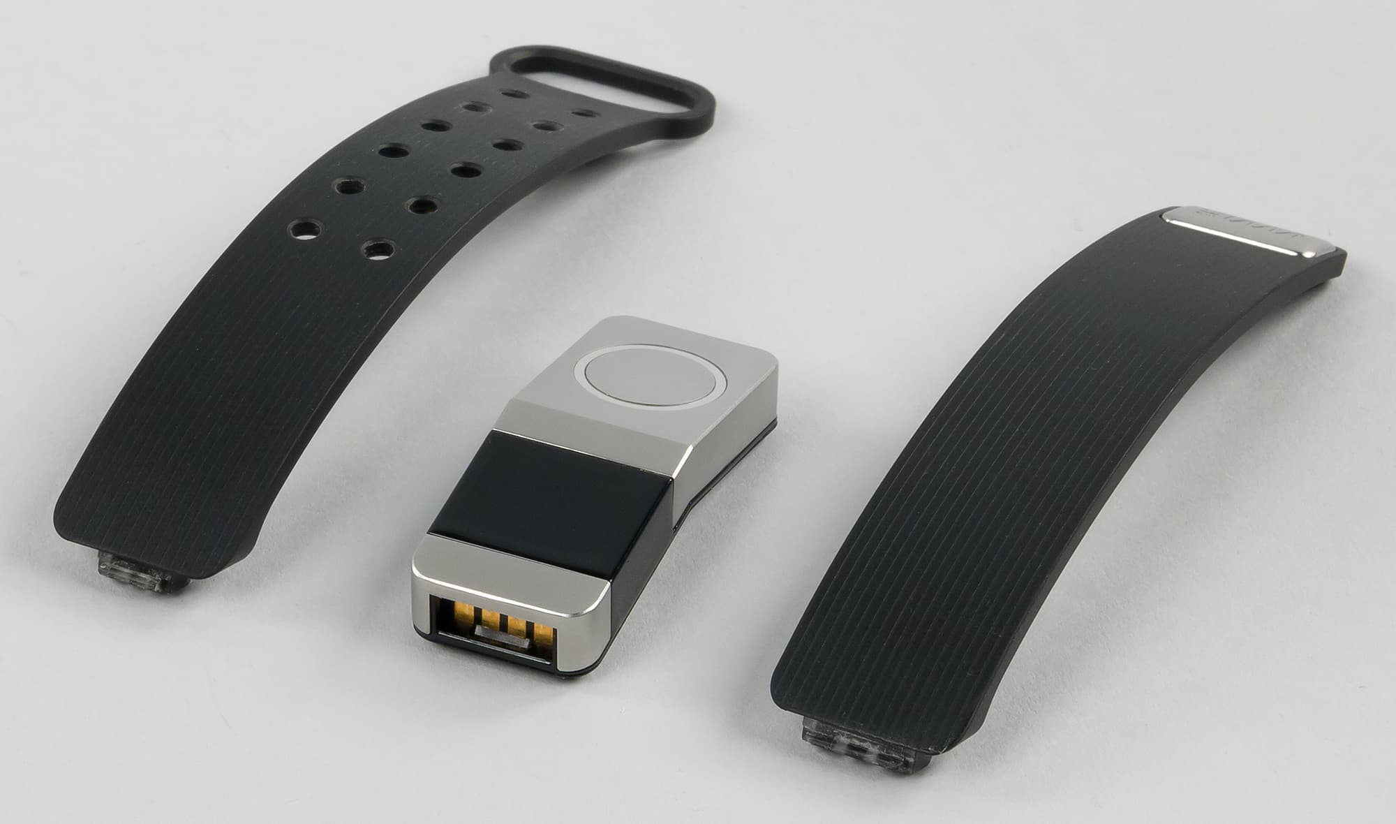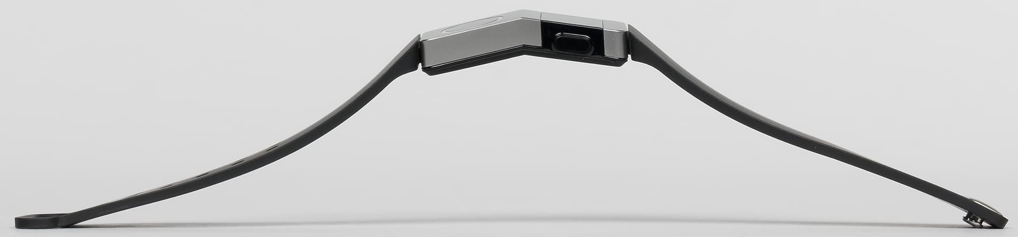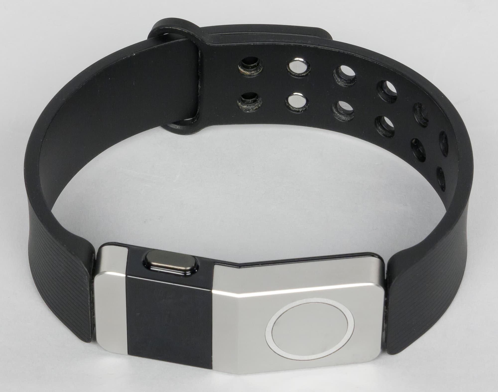 Силиконовый ремешок — черный, с едва заметными тонкими полосками вдоль всей длины. Застежка — очень простая, из двух металлических штырьков. Честно говоря, штырьки входят в отверстия на другой половине ремешка туговато, поэтому одной рукой застегнуть браслет проблематично.
