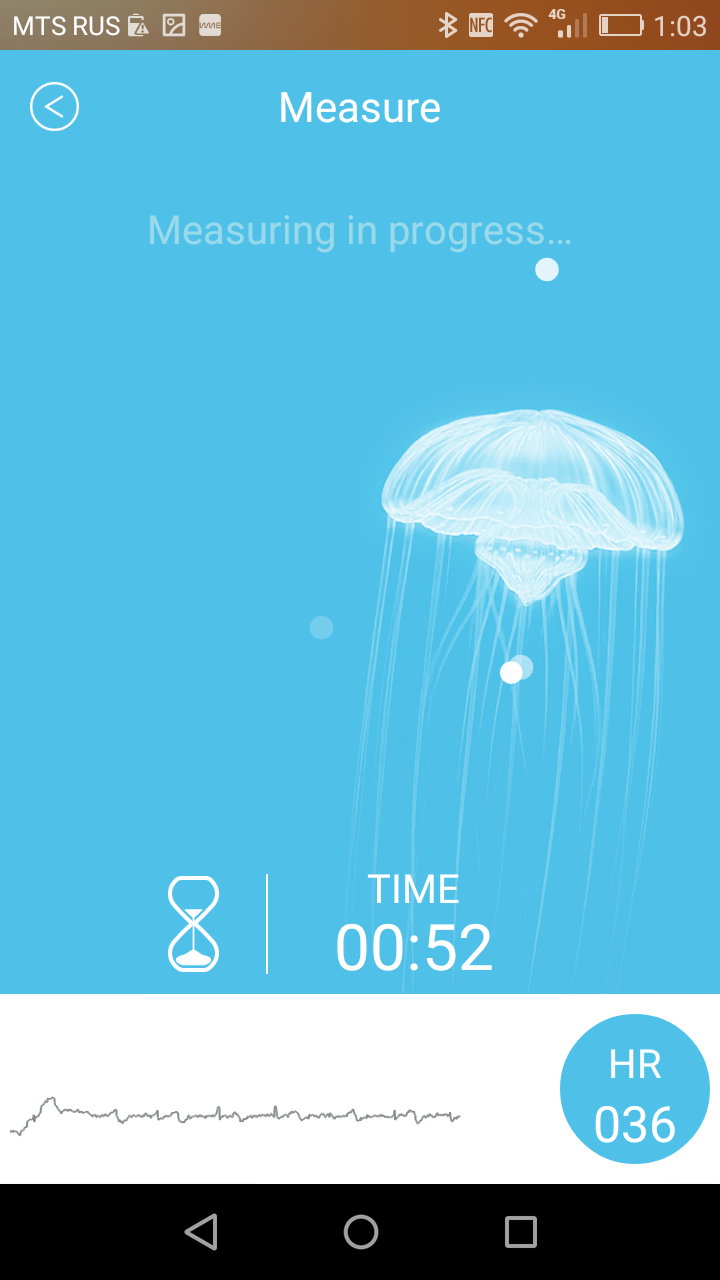 Теперь мы переходим к самому интересному и уникальному. Для этого кликаем на HRV Measure. Далее надо расположить большие пальцы двух рук на обозначенной кругом зоне устройства таким образом, чтобы они накрывали друг друга, а указательные пальцы — аналогичным образом на тыльной стороне, где металлический круг. Через несколько секунд вы увидите голубой экран, на котором будет написано Measuring in progress, внизу будет отображаться кардиограмма, справа в кружочке — определяемая частота сердечного ритма (первые несколько секунд она далека от реальной), а чуть выше будет секундомер с обратным отсчетом.