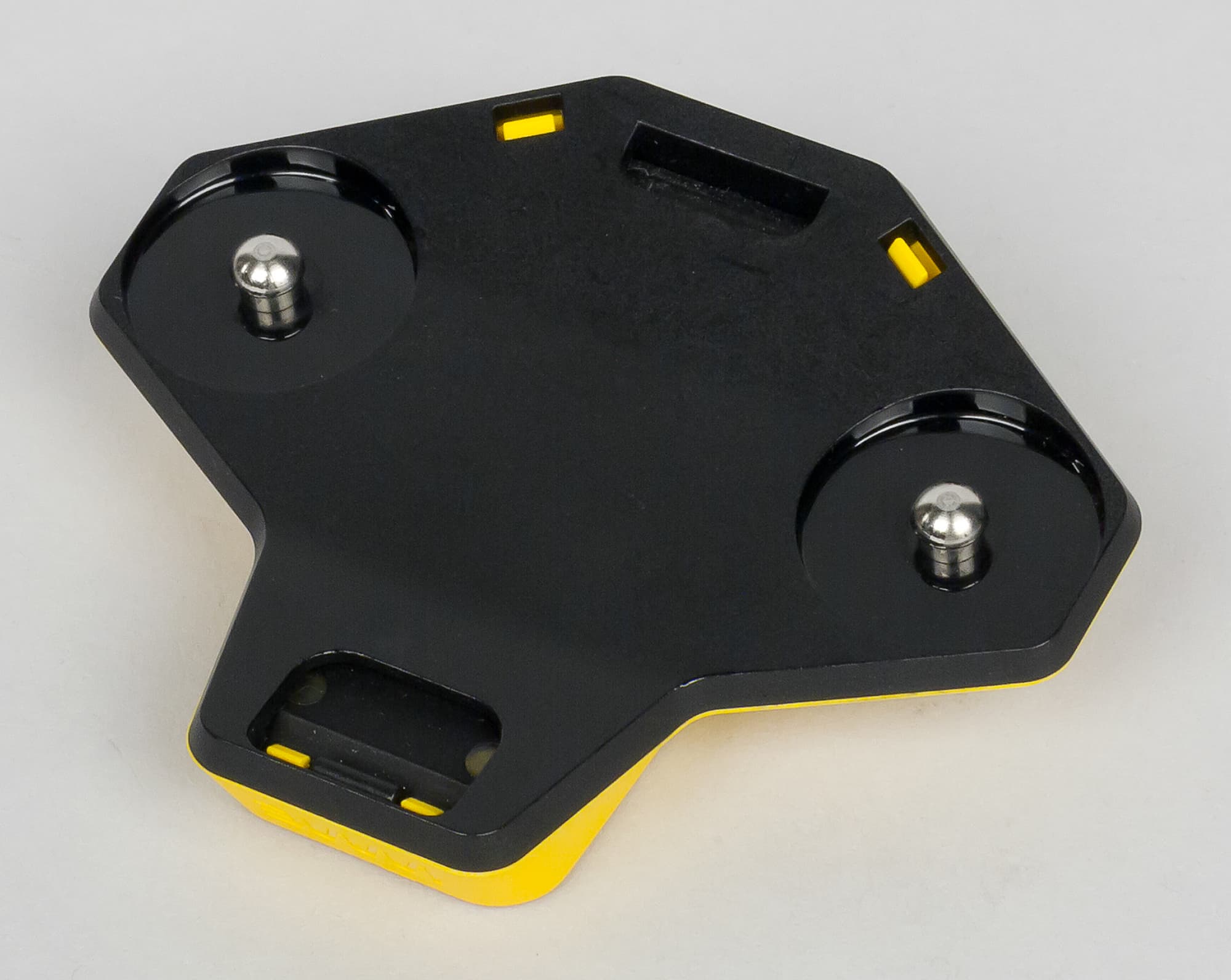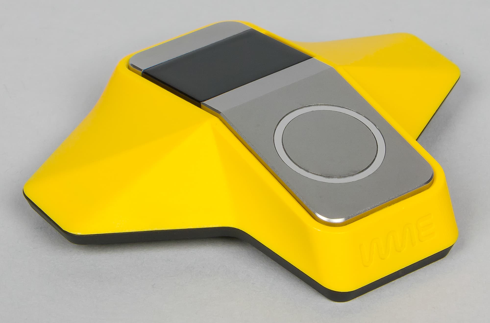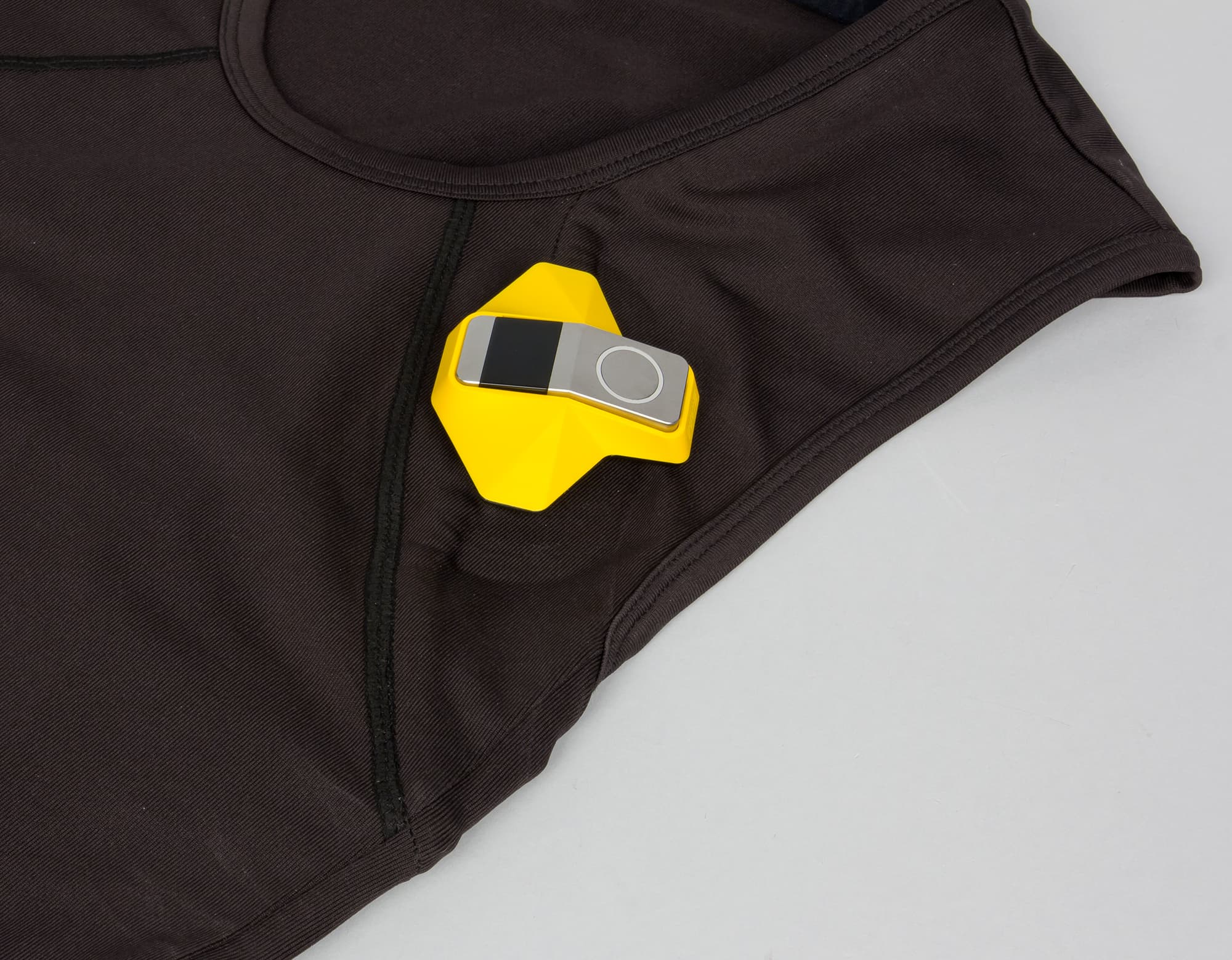Для того чтобы закрепить WMe 2 на футболке, надо сделать следующее. Сначала отсоединить от устройства половинки ремешка (это делается очень просто — достаточно чуть-чуть отогнуть каждую половинку вниз), далее вставить устройство в желтый пластиковый донгл. Получится такая конструкция.