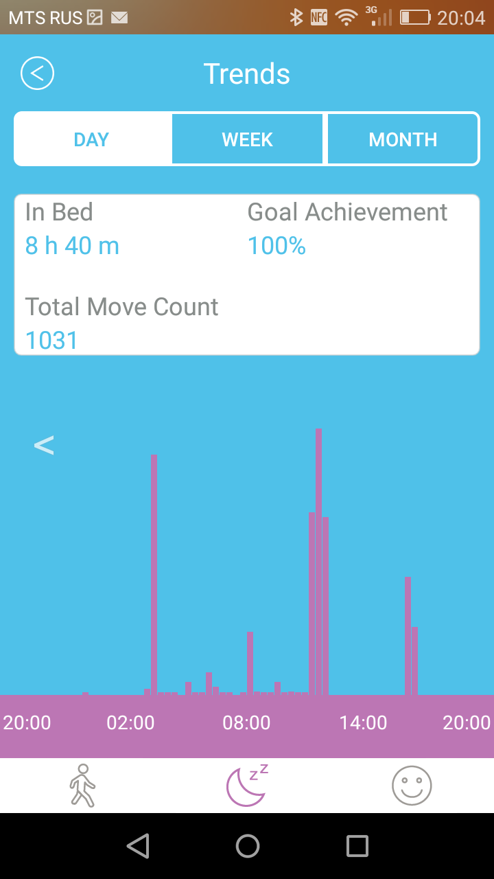 Отображение сведений по сну здесь реализовано существенно хуже, чем, например, у трекеров Jawbone или Misfit (см. скриншот над этим абзацем). В частности, нет деления на фазы сна, а вертикальные линии-столбики характеризуют движения, а не глубину сна, как у других устройств (при этом, видимо, сваливая в одну кучу и движения во время сна, и периоды бодрствования ночью). Вдобавок к этому, браслет не умеет самостоятельно определять начало сна (надо нажимать долгим нажатием кнопку на браслете), да еще и отсутствует умный будильник. Вместо него есть только будильник с фиксированным временем пробуждения. В общем, все, что связано со сном, здесь реализовано по принципу «чтобы было».