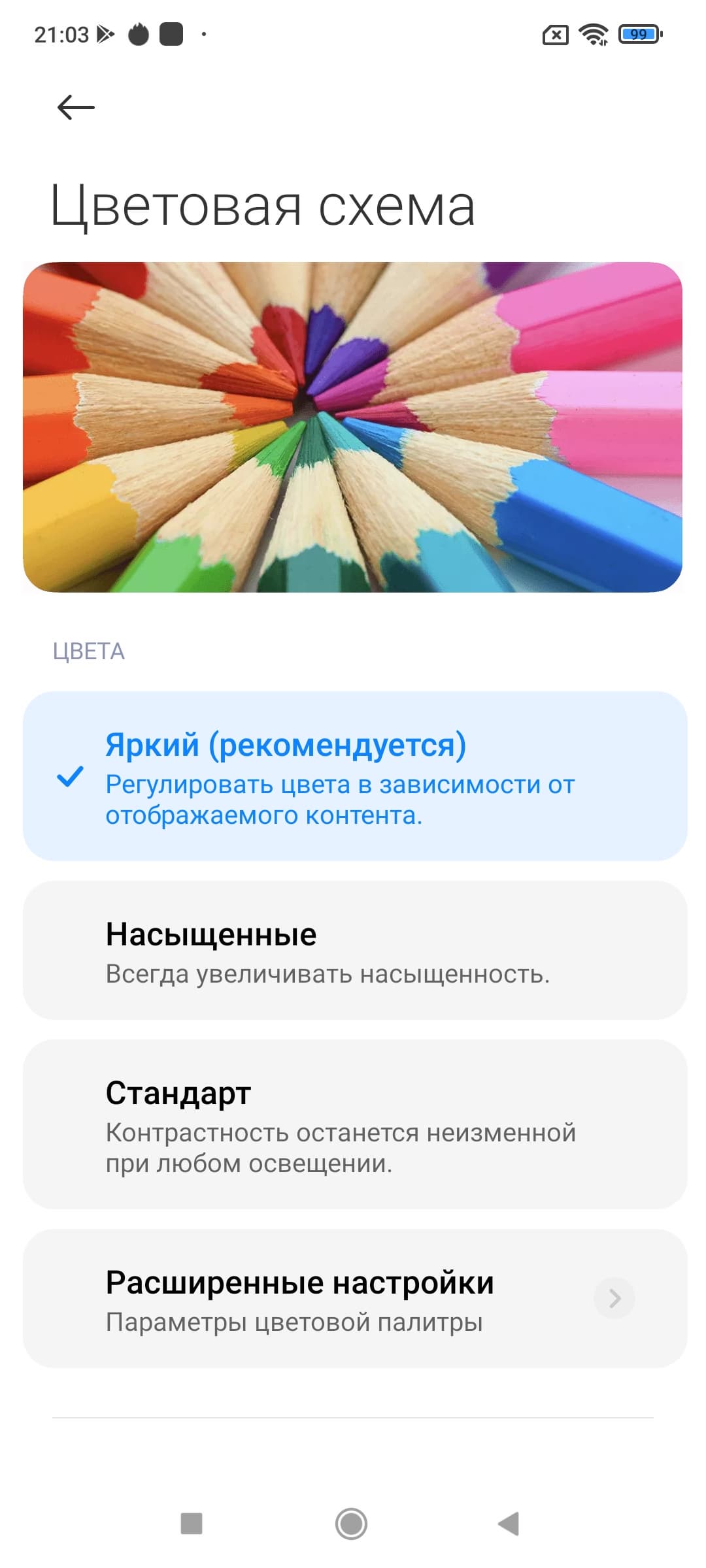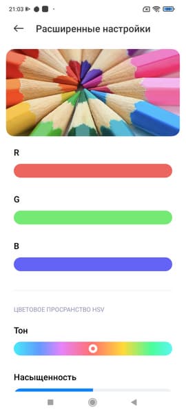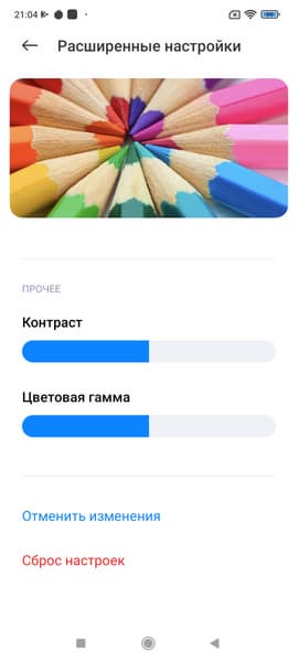 Фотография выше получена для профиля Яркий в настройках экрана. Базовых профилей три, а в четвертом можно вручную выбирать коррекцию цветового охвата, менять цветовой баланс многочисленными настройками и т.д:
