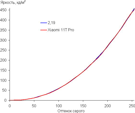 Напомним, что в случае OLED-экранов яркость фрагментов изображения динамично меняется в соответствии с характером выводимого изображения — немного уменьшается для светлых в целом изображений. В итоге полученная зависимость яркости от оттенка (гамма-кривая), скорее всего, не соответствует гамма-кривой статичного изображения, так как измерения проводились при последовательном выводе оттенков серого почти на весь экран.