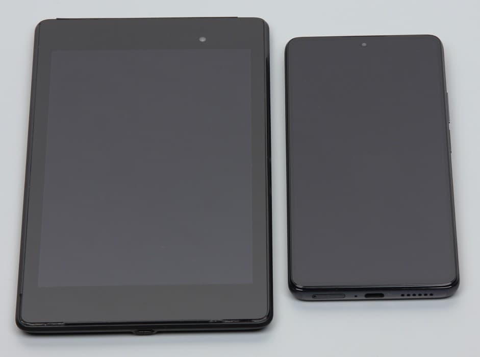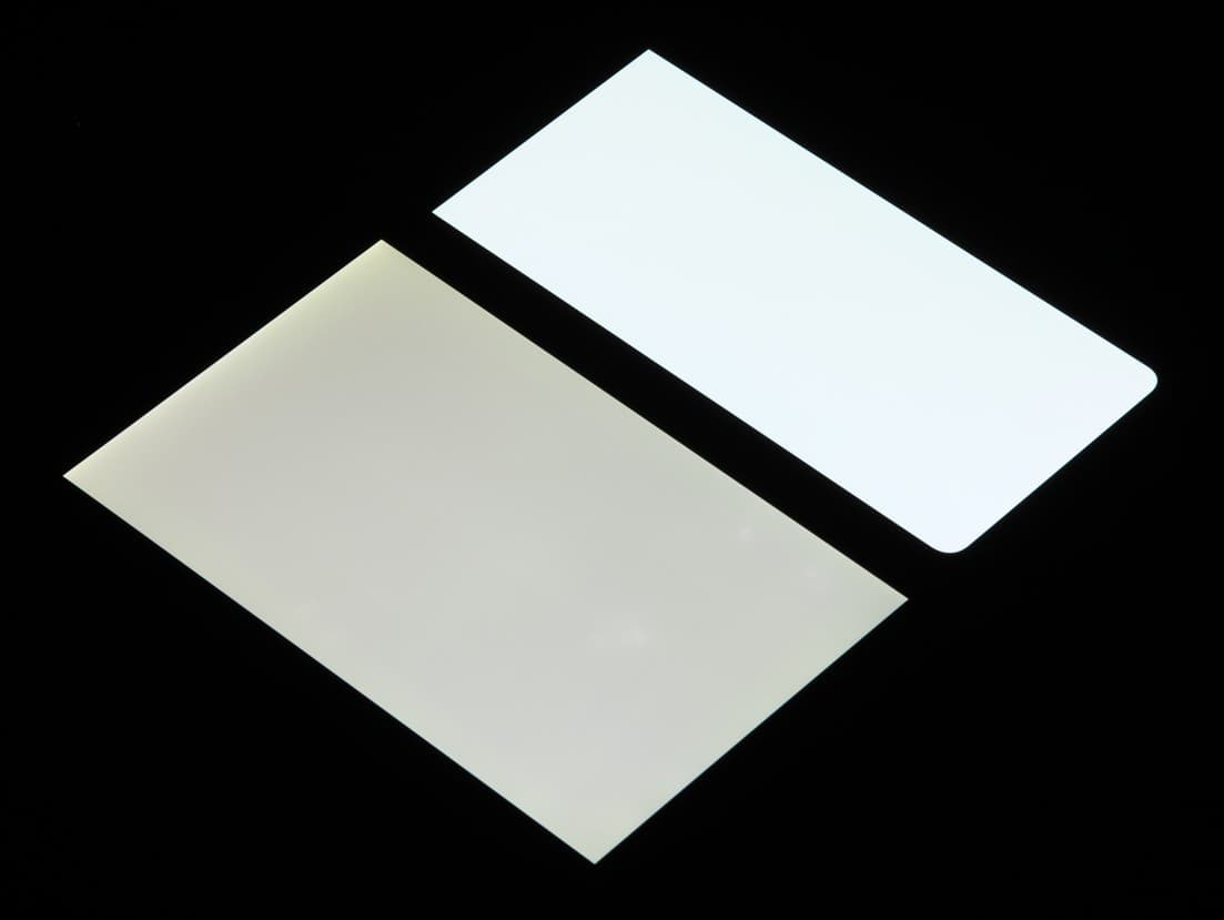 Лицевая поверхность экрана выполнена в виде стеклянной пластины с зеркально-гладкой поверхностью, устойчивой к появлению царапин. Судя по отражению объектов, антибликовые свойства экрана лучше, чем у экрана Google Nexus 7 (2013) (далее просто Nexus 7). Для наглядности приведем фотографию, на которой в выключенных экранах отражается белая поверхность (слева — Nexus 7, справа — Xiaomi 11T Pro, далее их можно различать по размеру):