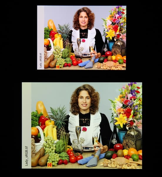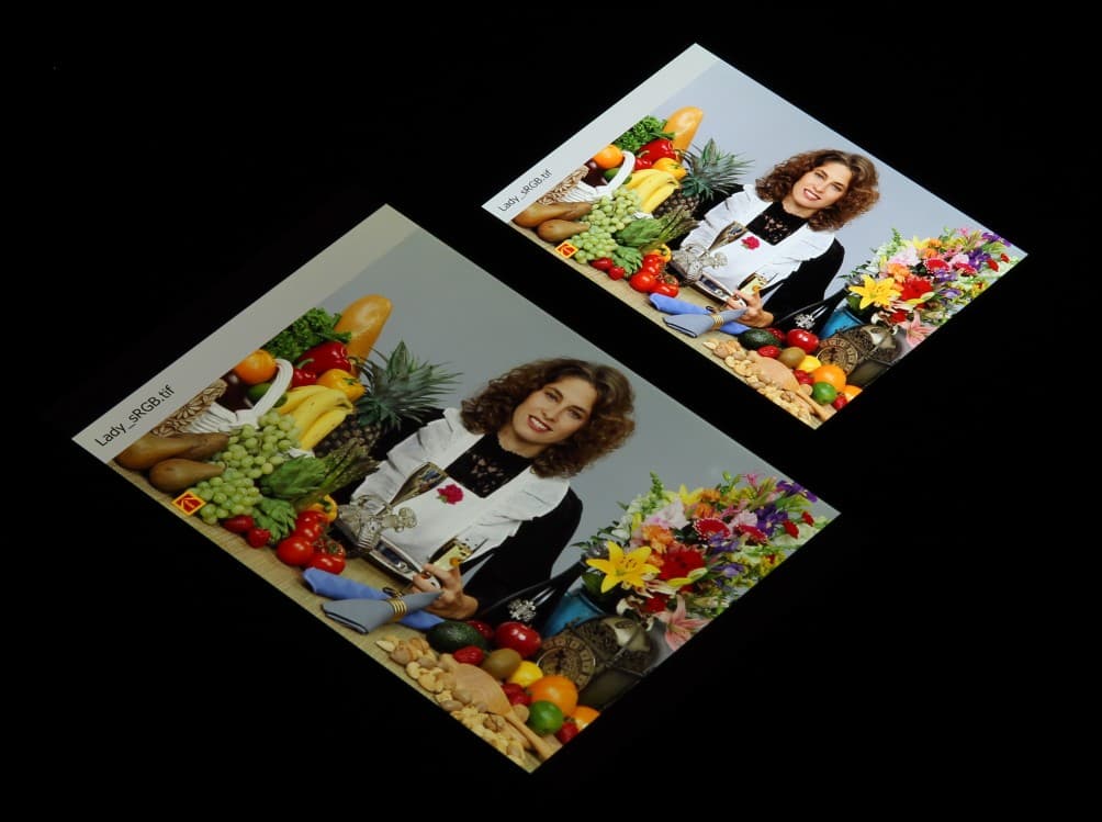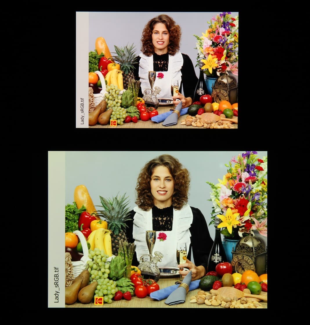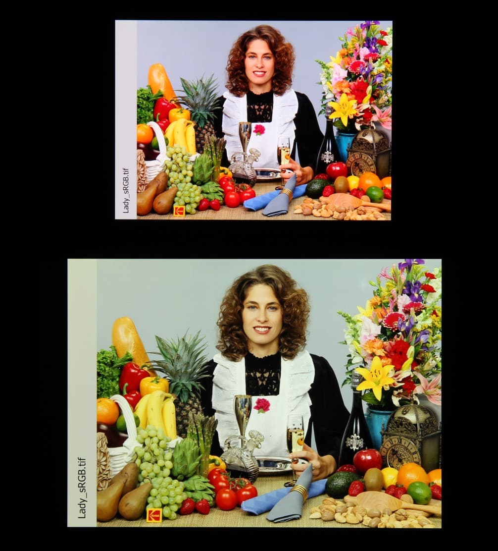 Цвета на экране Xiaomi 11T Pro перенасыщены (обратите внимание на помидоры, бананы, салфетку и оттенок лица), а цветовой баланс заметно отличается. Напомним, что фотография не может служить надежным источником сведений о качестве цветопередачи и приводится только для условной наглядной иллюстрации. В частности, выраженный красноватый оттенок белого и серого полей, присутствующий на фотографиях экрана Xiaomi 11T Pro, при перпендикулярном взгляде визуально отсутствует, что подтверждается аппаратными тестами с помощью спектрофотометра. Причина в том, что спектральная чувствительность матрицы фотоаппарата неточно совпадает с этой характеристикой человеческого зрения.