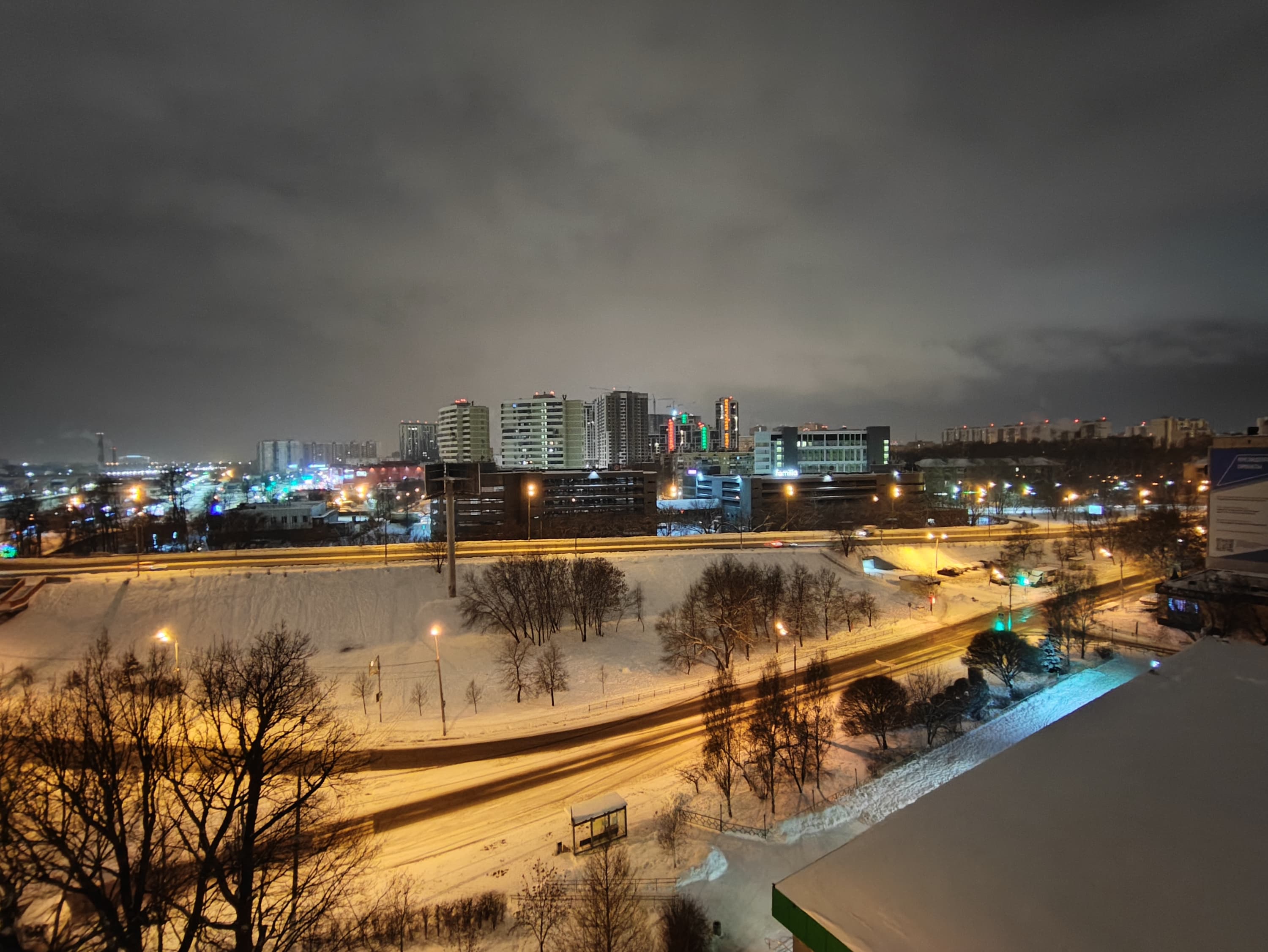 Ночной режим съемки доступен для всех трех значений «фокусных расстояний», но хорошие снимки можно сделать только на основную камеру. Кстати, в случае хорошо освещенного ночного пейзажа можно предпочесть использование обычного режима, потому что при принудительном включении ночного режима камера довольно сильно задирает экспозицию, преображая снимок почти в дневной.