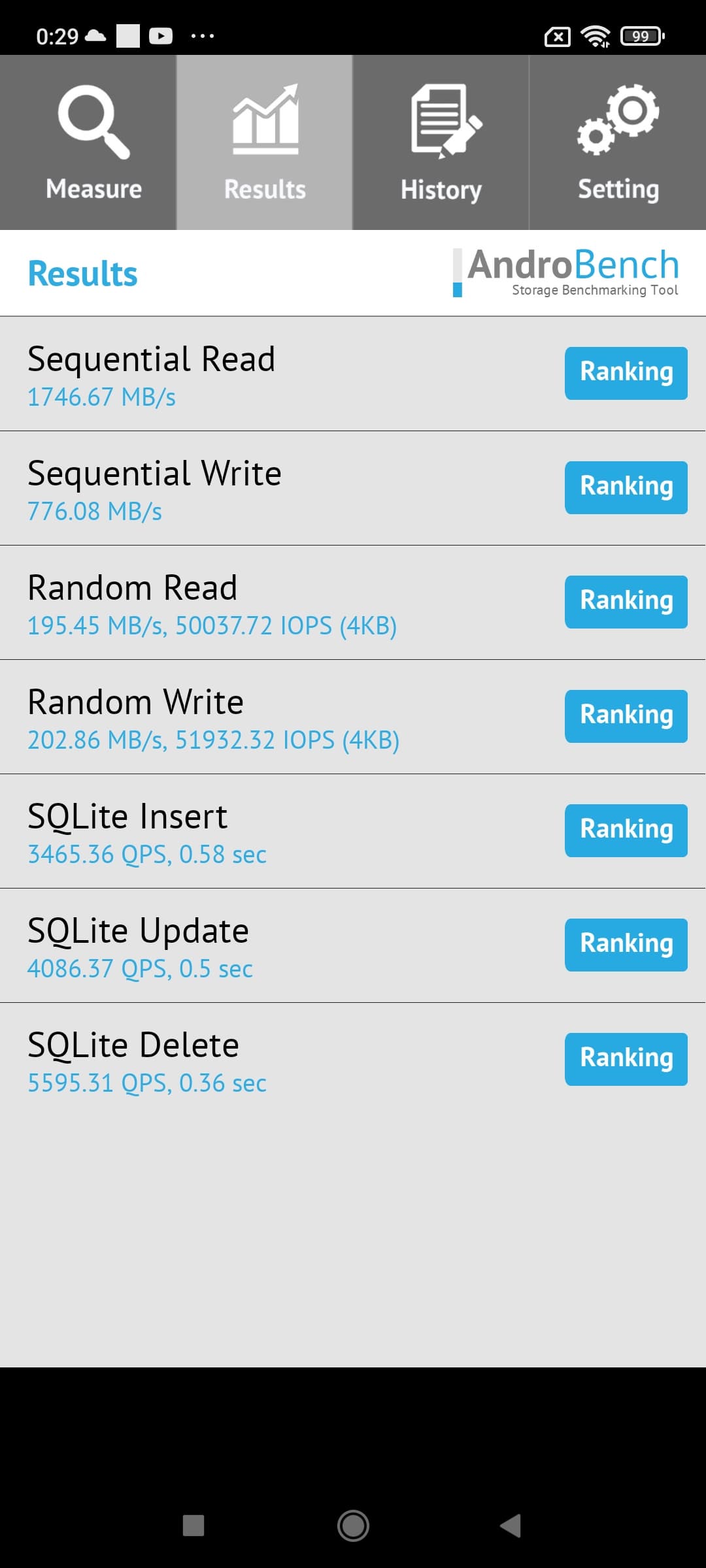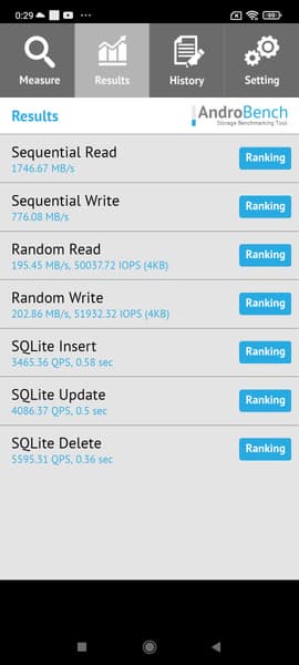 Результаты теста AndroBench на скорость работы с памятью: