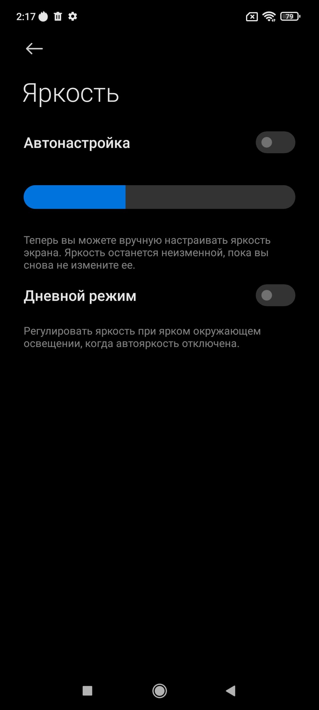При ручном управлении яркостью и при выводе белого поля во весь экран максимальное значение яркости составило около 470 кд/м² в обычных условиях, а на очень ярком свету и в случае автоматической регулировки оно может повышаться до 745 кд/м². Также нужно учитывать, что для этого типа экрана чем меньше площадь белого на экране, тем он светлее, то есть фактическая максимальная яркость белых участков будет почти всегда выше указанных значений. В итоге, учитывая отличные антибликовые свойства, читаемость днем на солнце, должна быть на хорошем уровне. При ручном управлении и при включении функции Дневной режим на очень ярком свету яркость повышается до 470 кд/м², даже если она была установлена на меньшее значение. Минимальное значение яркости — 2 кд/м², поэтому в полной темноте яркость можно понизить до комфортного значения. В наличии автоматическая регулировка яркости по датчику освещенности (он находится у верхнего края фронтальной панели левее центра по горизонтали). В автоматическом режиме при изменении внешних условий освещенности яркость экрана как повышается, так и понижается. Работа этой функции зависит от положения ползунка регулировки яркости: им пользователь может попытаться выставить желаемый уровень яркости в текущих условиях. Если не вмешиваться, то в полной темноте функция автояркости уменьшает яркость до 4 кд/м² (низковато), в условиях освещенного искусственным светом офиса (примерно 550 лк) устанавливает на 100 кд/м² (нормально), а условно на прямом солнечном свету яркость достигает 745 кд/м² (до максимума, так и нужно). Результат нас не устроил, поэтому в полной темноте мы увеличили яркость до 12 кд/м², однако после цикла повышения и понижения внешней освещенности все вернулось к тем значениям, что были по умолчанию. Получается, что функция автоподстройки яркости работает не совсем адекватно, и не позволяет пользователю настраивать свою работу под индивидуальные требования.