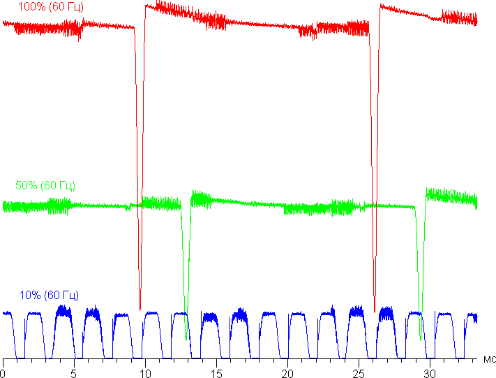 Видно, что на максимальной и средней яркости скважность модуляции низкая, в итоге видимого мерцания нет. Однако при сильном понижении яркости появляется модуляция с большой относительной амплитудой и высокой скважностью, ее наличие уже можно увидеть в тесте на присутствие стробоскопического эффекта или просто при быстром движении глаз. В зависимости от индивидуальной чувствительности такое мерцание может вызывать повышенную утомляемость. Впрочем, фаза модуляции различается по площади экрана, да и частота (480 Гц) довольно высокая, поэтому негативный эффект от мерцания снижен.