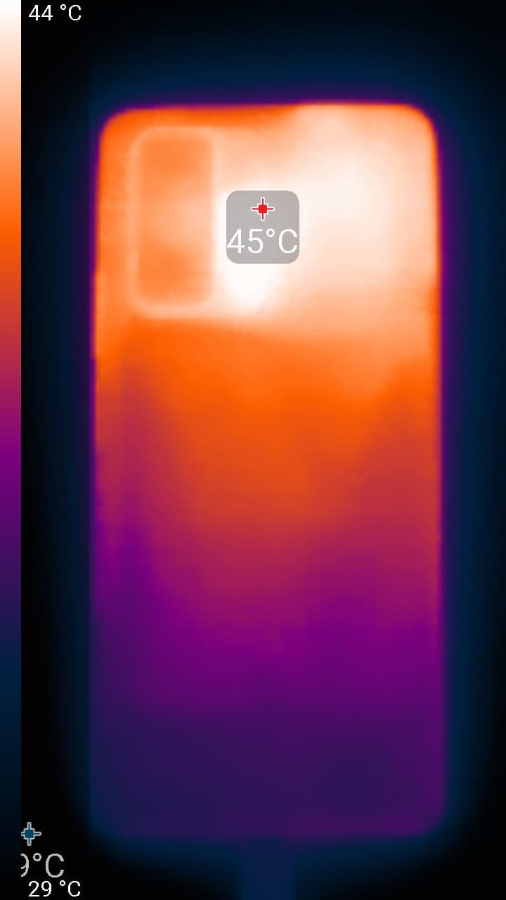 Нагрев больше в верхней части аппарата, что, видимо, соответствует расположению микросхемы SoC. По данным теплокамеры, максимальный нагрев составил 45 градусов (при температуре окружающего воздуха в 24 градуса), это существенно выше среднего значения в данном тесте для современных смартфонов.