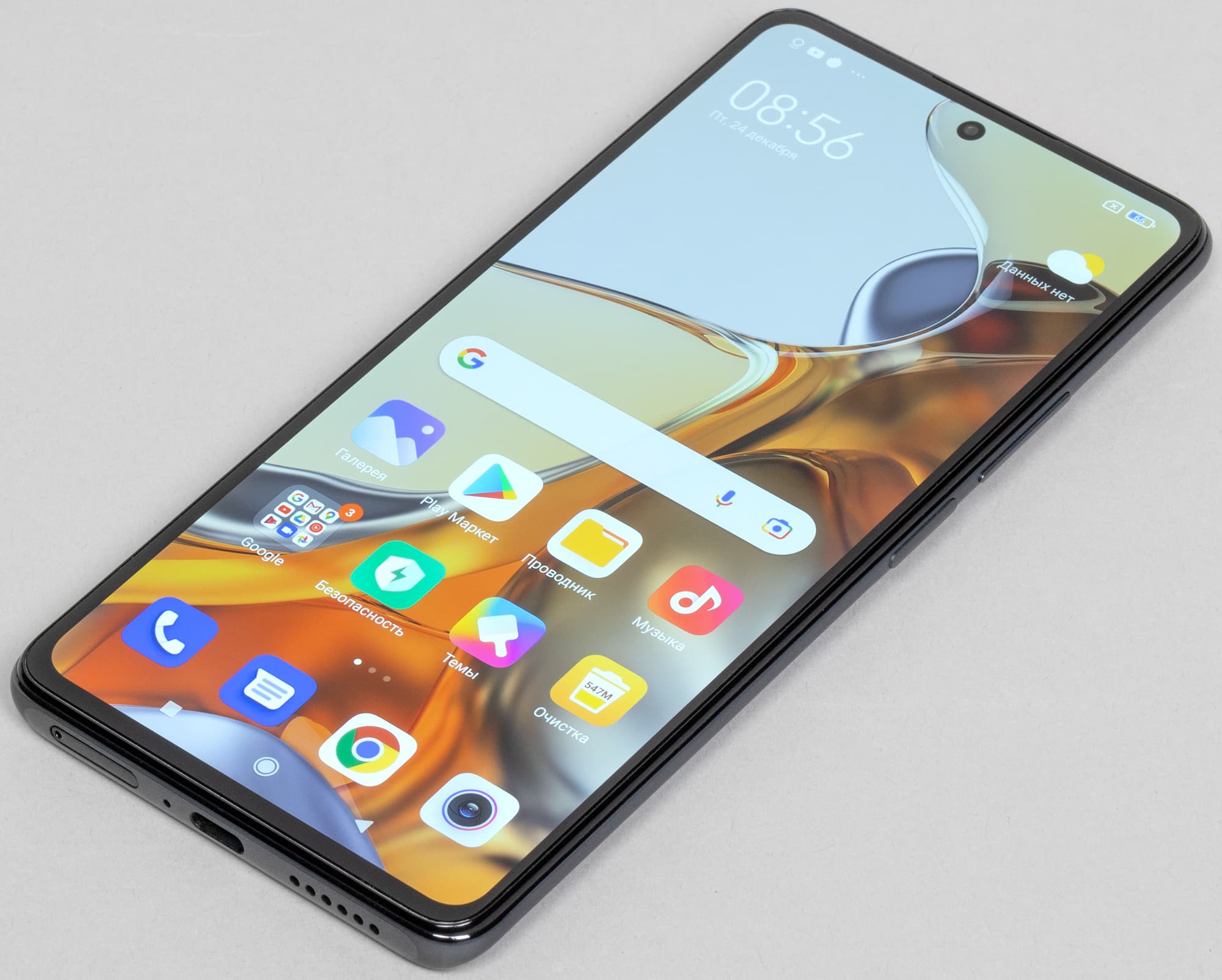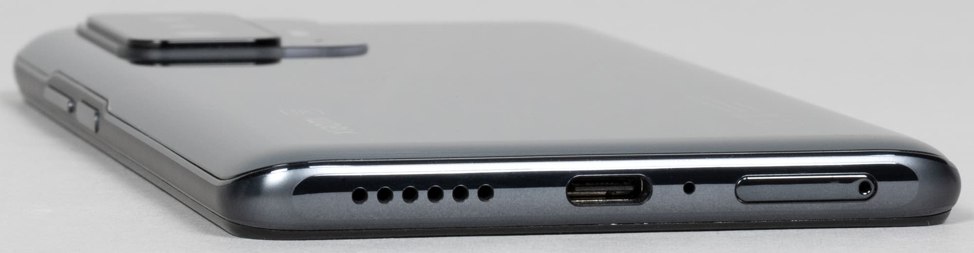 На нижнем торце собраны остальные элементы: динамик, микрофон, USB-разъем (Type-C). Отсюда же выдвигается лоток для SIM-карт.
