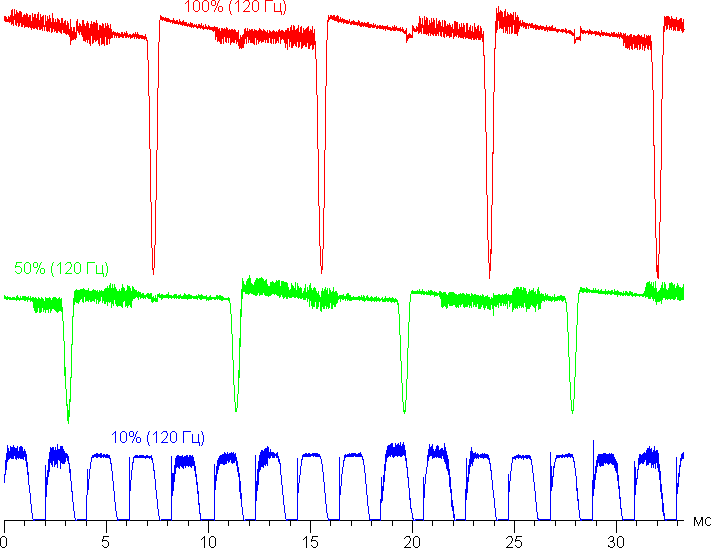 Видно, что на высокой и средней яркости частота модуляции увеличилась в 2 раза, а на низкой яркости характер модуляции не изменился. Отметим, что частота обновления 120 Гц устанавливается, только если на экран выводится динамическое изображение.