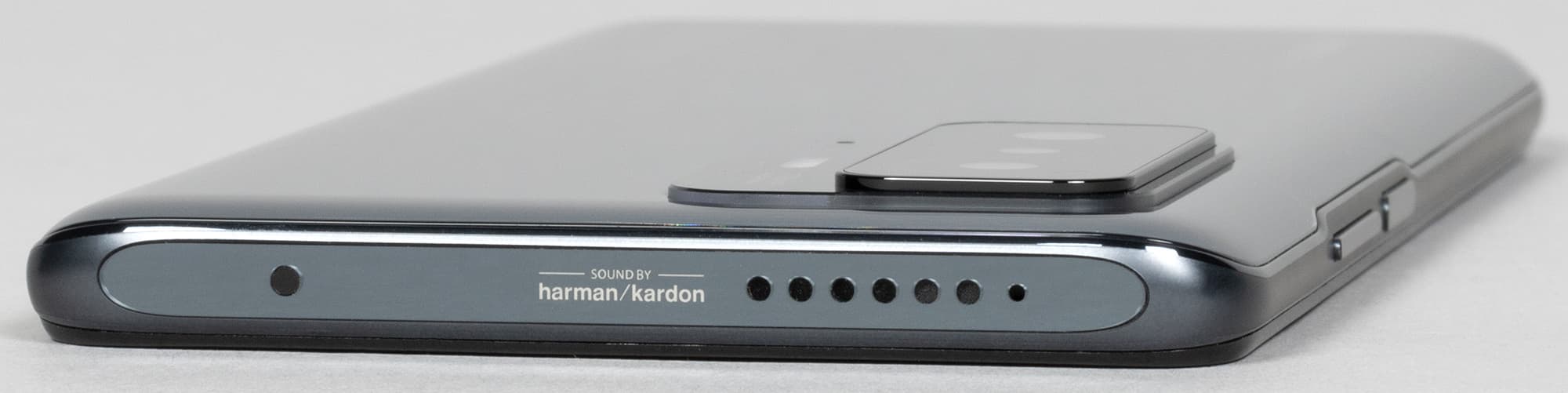 На торце сверху имеется вспомогательный микрофон и второй динамик. Принадлежность стереодинамиков к бренду Harman Kardon обозначена соответствующей надписью. Верхний и нижний торцы плоские. Лучше бы такими же плоскими сделали боковины, тогда аппарат крепче удерживался бы в руке.