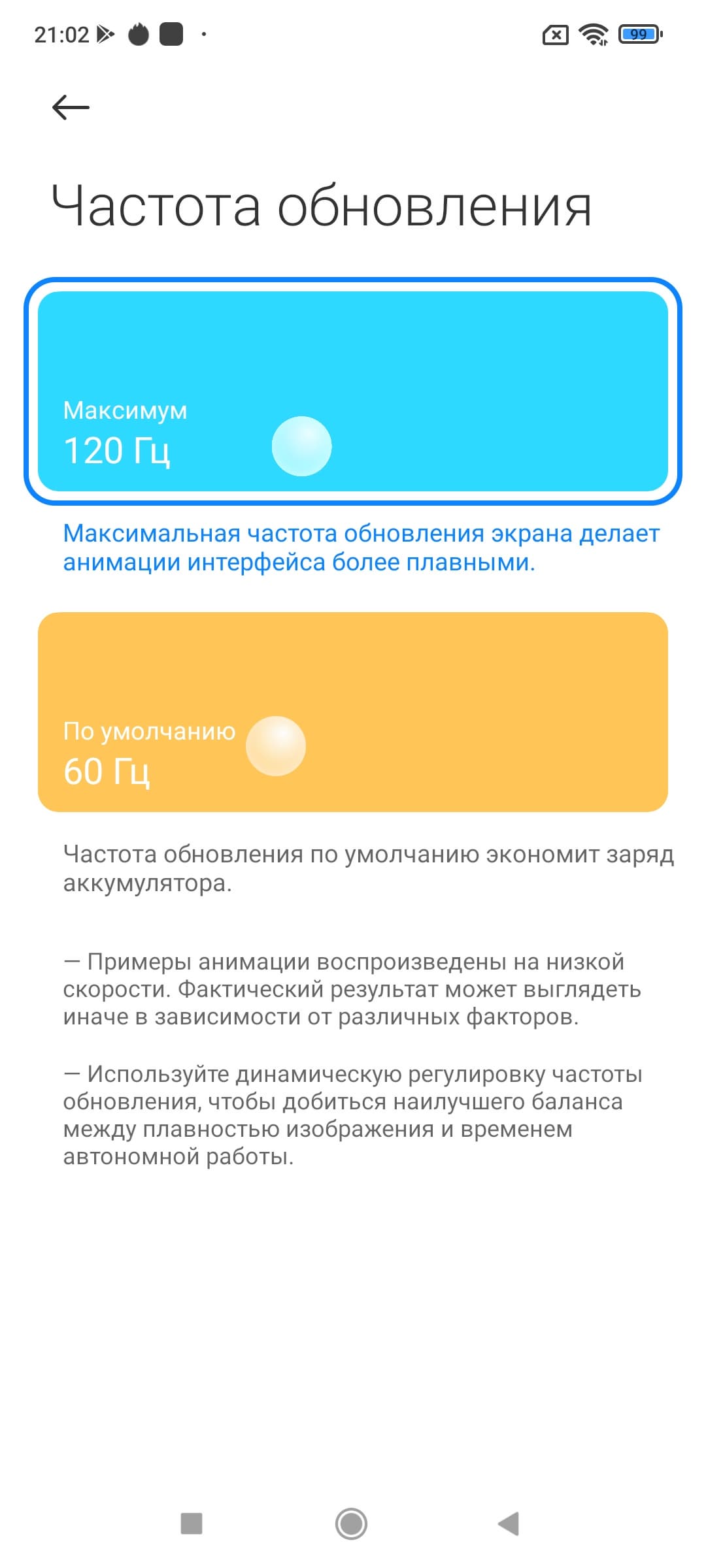 В настройках экрана можно включить режим с повышенной до 120 Гц частотой обновления: