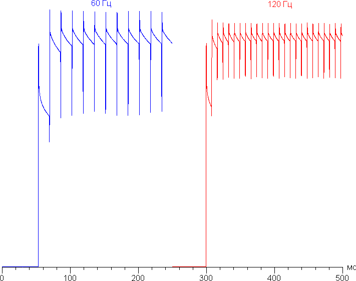 Переключение состояния элементов матрицы выполняется практически мгновенно, но на фронте включения может присутствовать ступенька шириной примерно 17 мс (что соответствует частоте обновления экрана примерно в 60 Гц) или примерно 8 мс (120 Гц). Например, так выглядят зависимости яркости от времени при переходе от черного к белому: