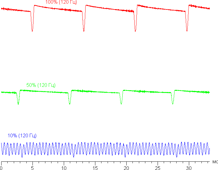 Видно, что на высокой и средней яркости частота модуляции увеличилась в 2 раза, а на низкой яркости характер модуляции принципиально не изменился. Отметим, что частота обновления 120 Гц устанавливается, только если на экран выводится динамическое изображение.
