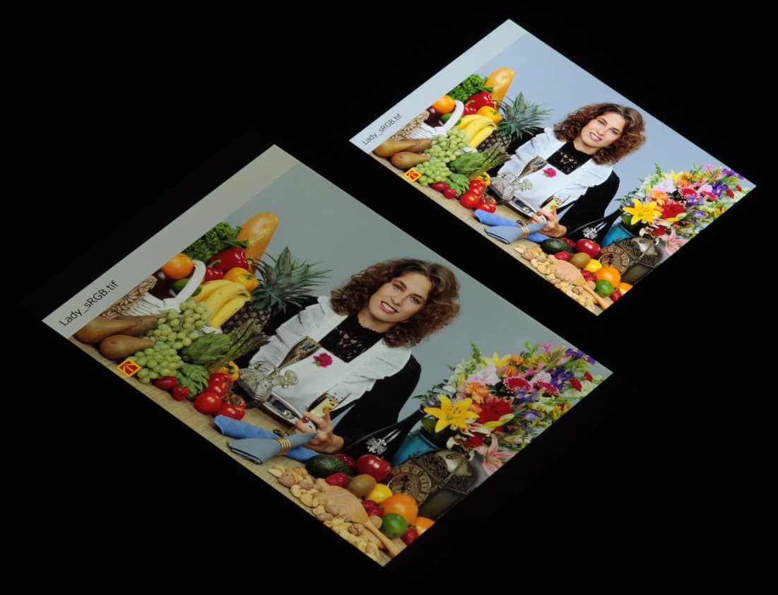 Экран характеризуется великолепными углами обзора. Правда, белый цвет при отклонении на большие углы приобретает легкий сине-зеленый оттенок, но черный цвет остается просто черным под любыми углами. Он настолько черный, что параметр контрастности в данном случае неприменим. Для сравнения приведем фотографии, на которых на экраны Xiaomi 12T Pro и Nexus 7 выведены одинаковые изображения, при этом яркость экранов изначально установлена примерно на 200 кд/м², а цветовой баланс на фотоаппарате принудительно переключен на 6500 К.