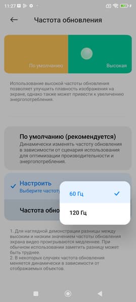 В настройках экрана можно включить режим с повышенной до 120 Гц частотой обновления: