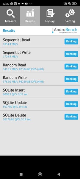 Результаты теста AndroBench на скорость работы с памятью: