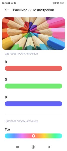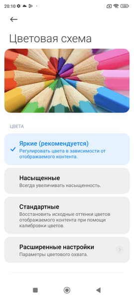 Фотография выше получена для профиля Яркие в настройках экрана. Базовых профилей три, а в четвертом можно вручную выбирать коррекцию цветового охвата, менять цветовой баланс многочисленными настройками и т. д.: