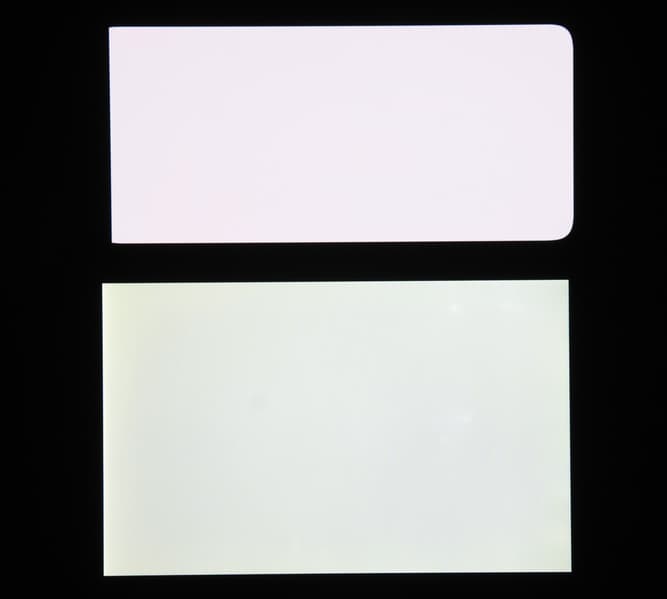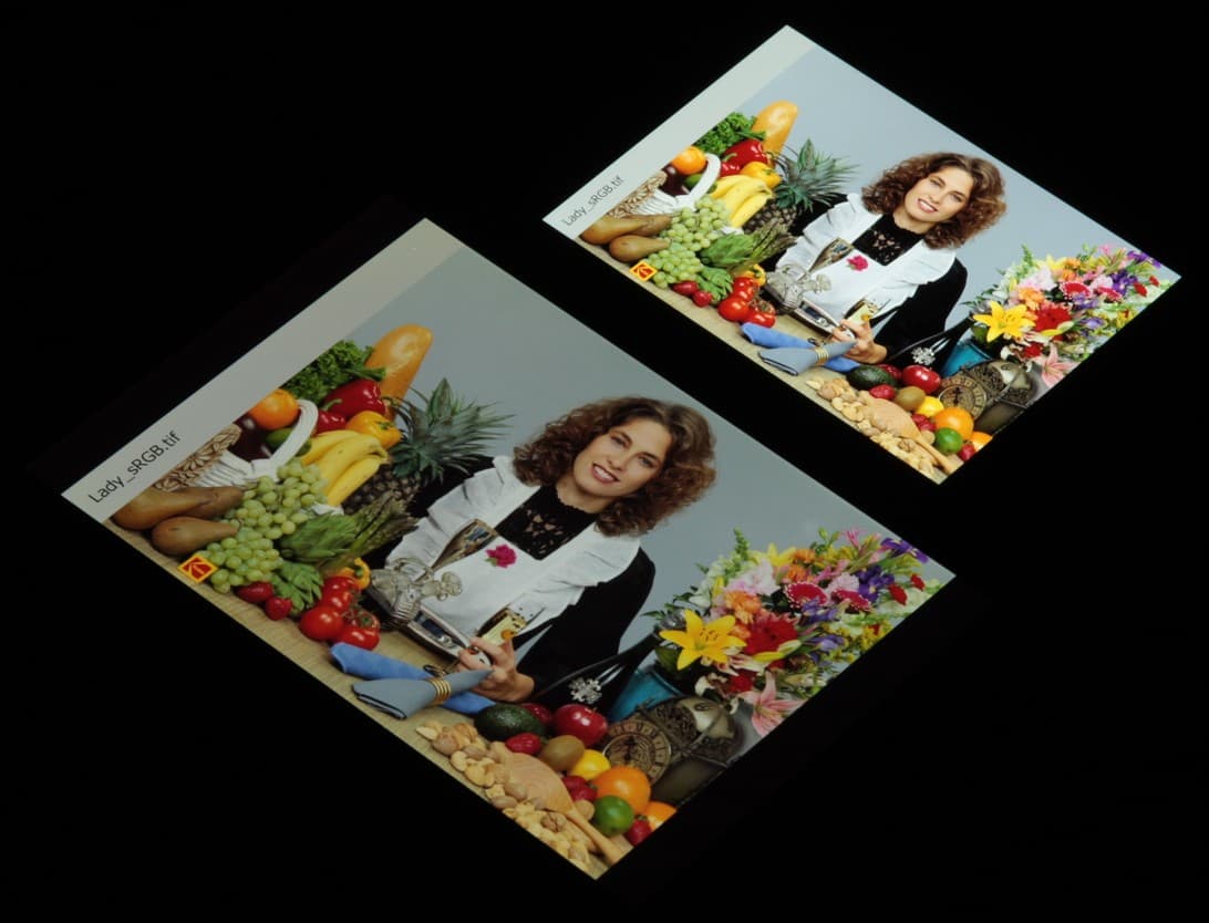 Экран характеризуется великолепными углами обзора. Правда, белый цвет при отклонении на большие углы приобретает легкий сине-зеленый оттенок, но черный цвет остается просто черным под любыми углами. Он настолько черный, что параметр контрастности в данном случае неприменим. Для сравнения приведем фотографии, на которых на экраны Xiaomi 12T и Nexus 7 выведены одинаковые изображения, при этом яркость экранов изначально установлена примерно на 200 кд/м², а цветовой баланс на фотоаппарате принудительно переключен на 6500 К.