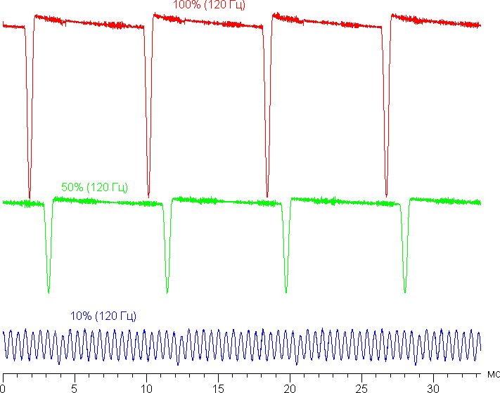 Видно, что на высокой и средней яркости частота модуляции увеличилась в 2 раза, а на низкой яркости характер модуляции принципиально не изменился. Отметим, что частота обновления 120 Гц устанавливается, только если на экран выводится динамическое изображение.