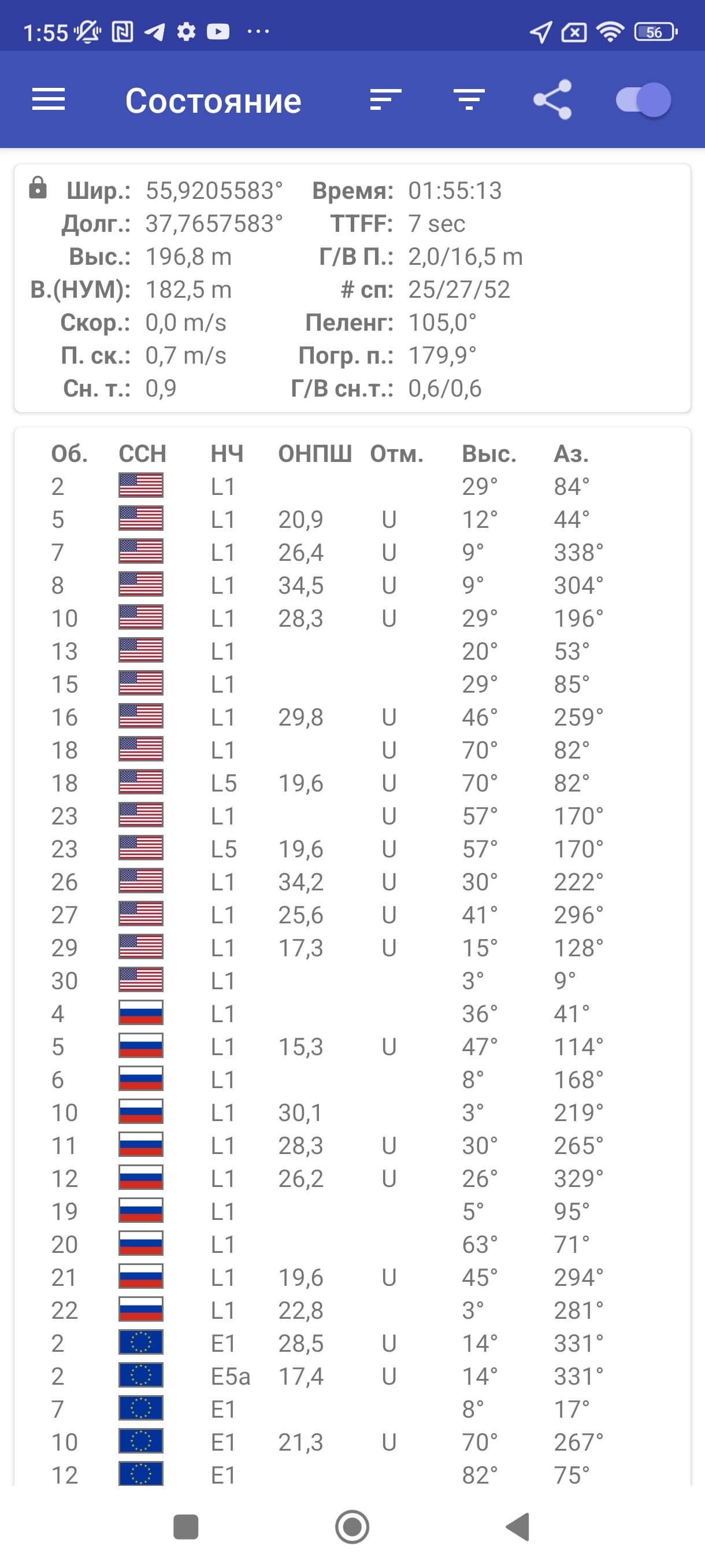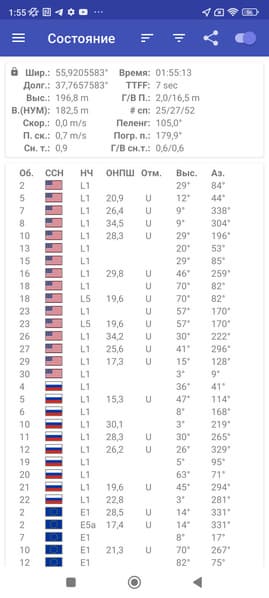 Навигационный модуль работает с GPS (L1+L5), Глонасс (L1), BDS (B1I+B1c+B2a), Galileo (E1+E5a), QZSS (L1+L5), NavIC (L5). Первые спутники при холодном старте обнаруживаются быстро, точность позиционирования не вызывает претензий.