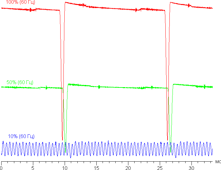 На высоком и среднем уровне яркости присутствует значимая модуляция с частотой примерно 60 или 120 Гц. На рисунке ниже приведены зависимости яркости (вертикальная ось) от времени (горизонтальная ось) для нескольких значений настройки яркости. Сначала для режима с частотой обновления 60 Гц: