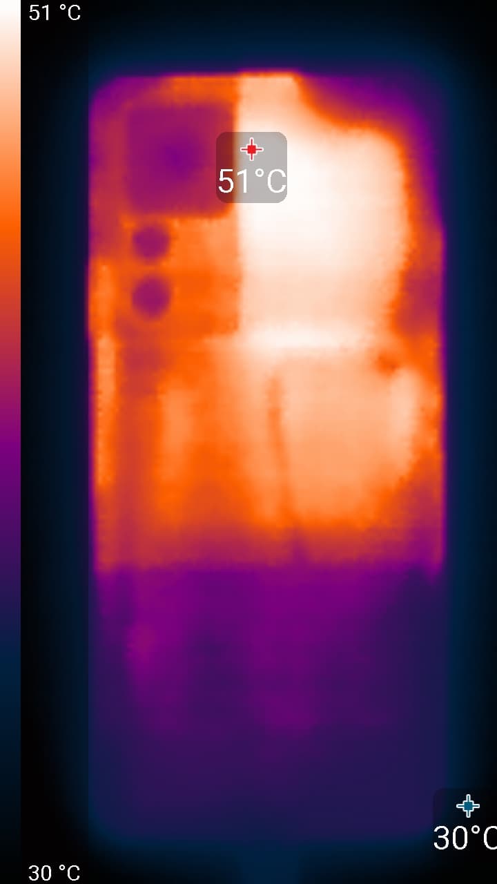 Нагрев больше в верхней части аппарата, что, видимо, соответствует расположению микросхемы SoC. По данным теплокамеры, максимальный нагрев составил 51 градус (при температуре окружающего воздуха в 24 градуса), это типичный нагрев в случае данного теста в сравнении с другими современными производительными смартфонами. Для более-менее точного определения температуры на заднюю поверхность смартфона пришлось наклеить кусок тонкой клейкой ленты, что увеличило коэффициент излучения поверхности до значения, близкого к единице. Без клейкой ленты температура, определенная с помощью теплокамеры, была занижена на три градуса.