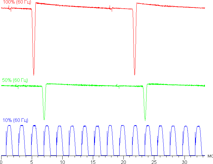 На высоком и среднем уровне яркости присутствует значимая модуляция с частотой примерно 60 или 120 Гц. На рисунке ниже приведены зависимости яркости (вертикальная ось) от времени (горизонтальная ось) для нескольких значений настройки яркости. Сначала для режима с частотой обновления 60 Гц: