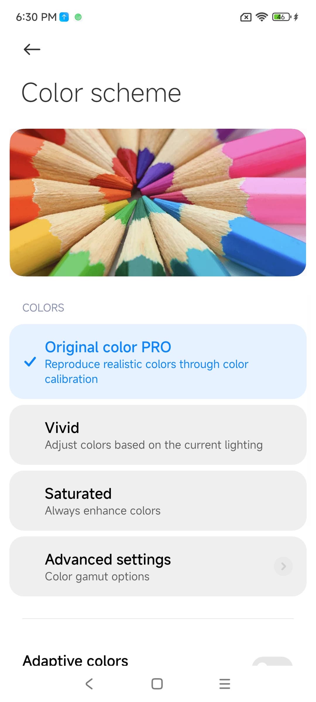 Фотография выше получена для профиля Original color Pro в настройках экрана, который выбран по умолчанию. Базовых профилей три, а на вкладке Advanced settings можно выбирать еще три профиля и менять цветовой баланс многочисленными настройками и т.д: