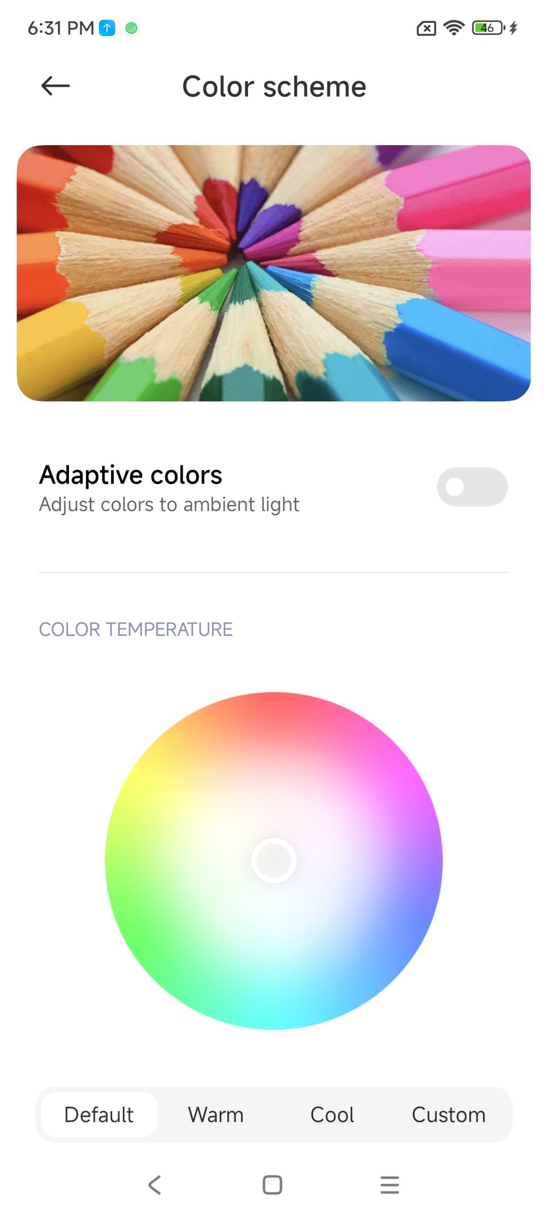 При сильном изменении условий освещенности подстройка цветового баланса выражена слабо, поэтому с нашей точки зрения эта функция не работает так, как нужно. Отметим, что сейчас сложившимся стандартом является калибровка устройств отображения к точке белого в 6500 К, но в принципе, коррекция под цветовую температуру внешнего света может принести пользу, если хочется добиться лучшего соответствия изображения на экране с тем, что видно на бумаге (или на любом носителе, на котором цвета формируются за счет отражения падающего света) в текущих условиях.