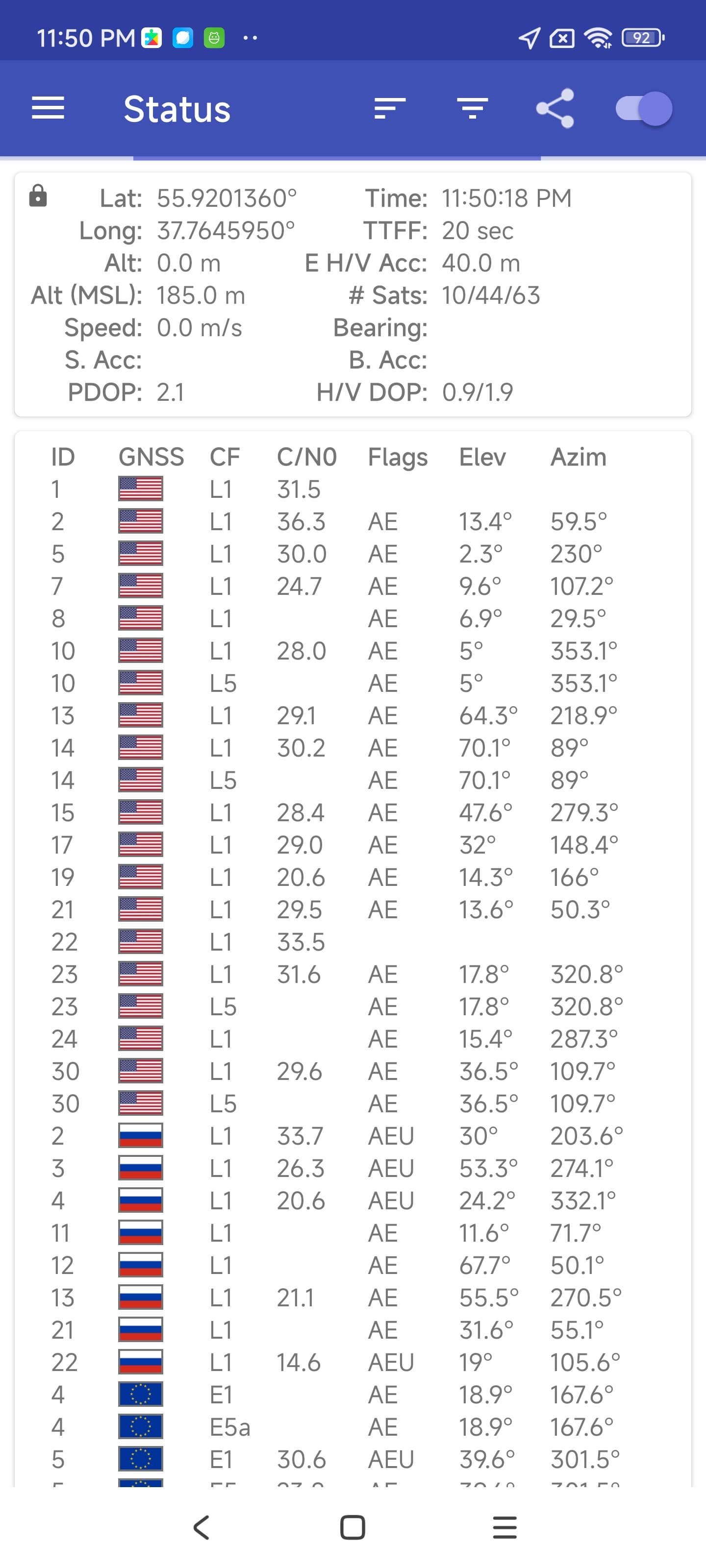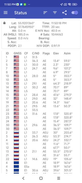 Двухдиапазонный модуль спутниковой навигации работает с GPS (L1+L5), а также Глонасс, BeiDou и Galileo. Первые спутники при холодном старте обнаруживаются быстро, точность позиционирования не вызывает претензий.