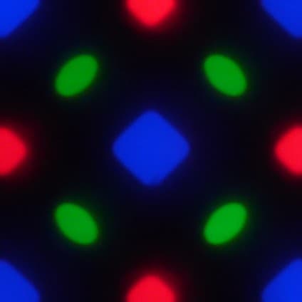 На фрагменте выше можно насчитать 4 зеленых субпикселя, 2 красных (4 половинки) и 2 синих (1 целый и 4 четвертушки), при этом, повторяя эти фрагменты, можно выложить весь экран без разрывов и перехлеста. Для таких матриц компания Samsung ввела наименование PenTile RGBG. Разрешение экрана производитель считает по зеленым субпикселям, по двум другим оно будет ниже. Разумеется, присутствуют некоторая неровность контрастных границ и другие артефакты. Впрочем, из-за очень высокого разрешения они лишь минимально сказываются на качестве изображения.