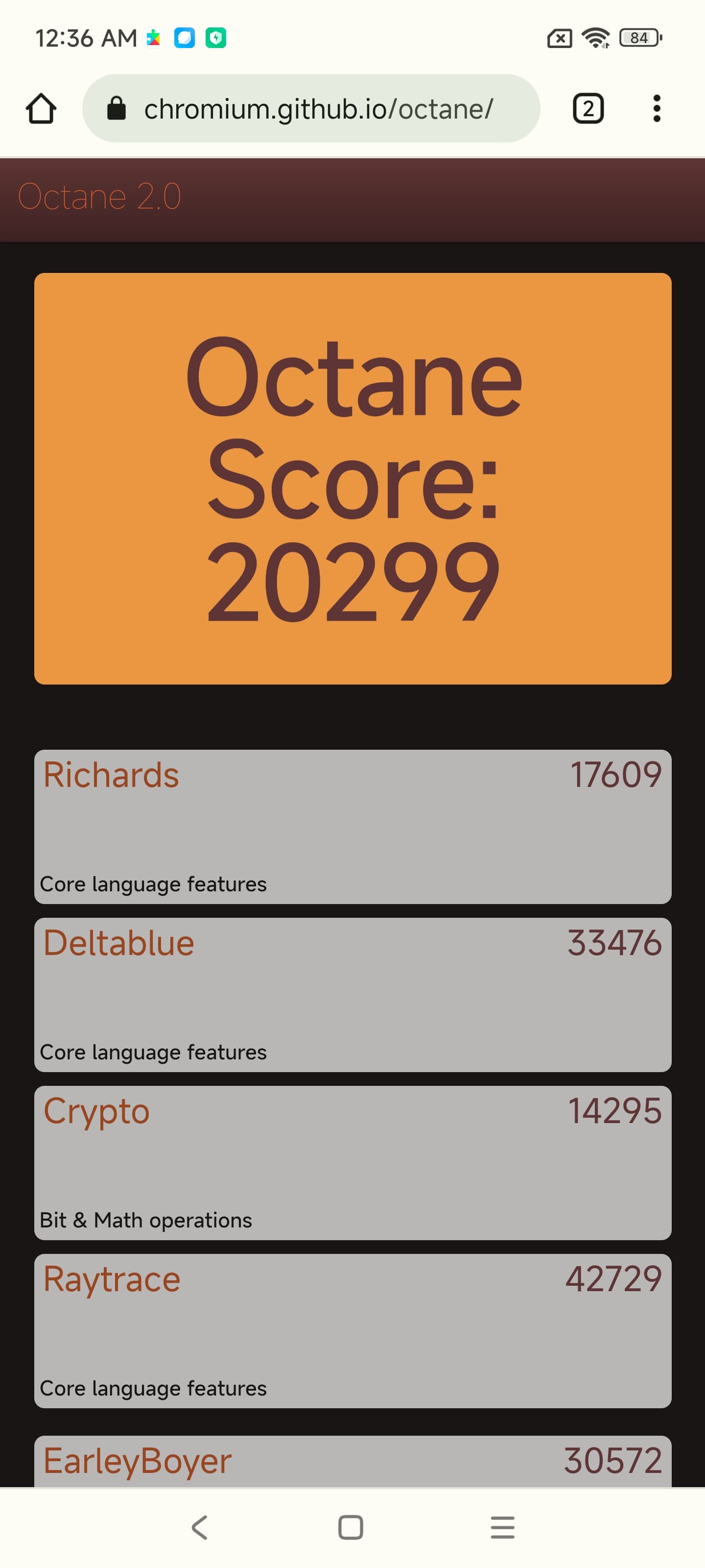 | Google Octane 2 (больше — лучше) | 20299 | 53298 | 59248 | 30430 | 54735 |